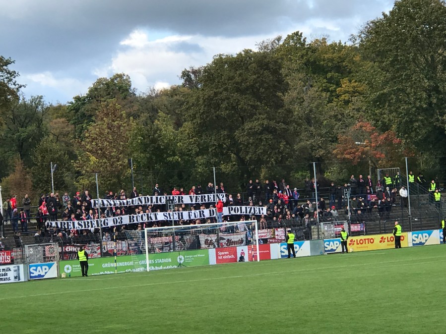 Erfurt hingegen gefiel mir richtig gut. Zahlenmäßig war das zwar nicht ganz so wie ich es erwartet hatte, dafür zogen aber gut und gerne 350 Leute das gesamte Spiel einen tollen Support durch. Sehr melodisch, tolle Trommelrythmen, gute Zaunbeflaggung. Fußballherz was möchtest Du mehr? Zudem waren sie deutlich lauter als die Babelsberger. Erfurt zeigte noch ein Spruchband in Richtung Babelsberg: „Fanfreundlicher Verein? Babelsberg 03 bückt sich für die Polizei“. Danke für diesen schönen Auftritt!