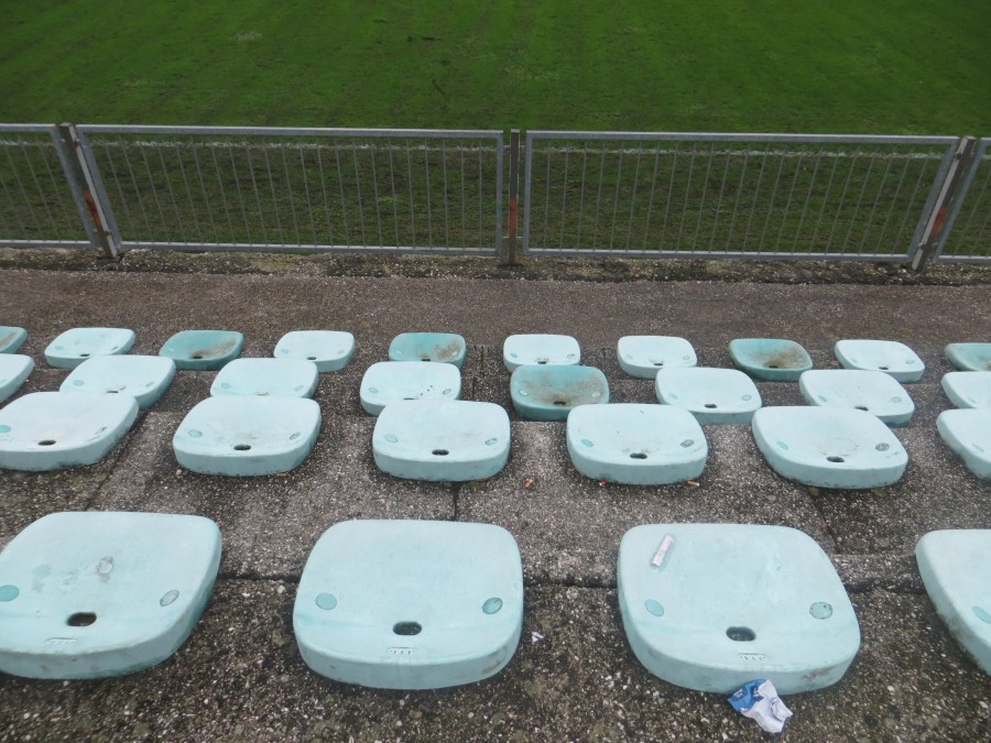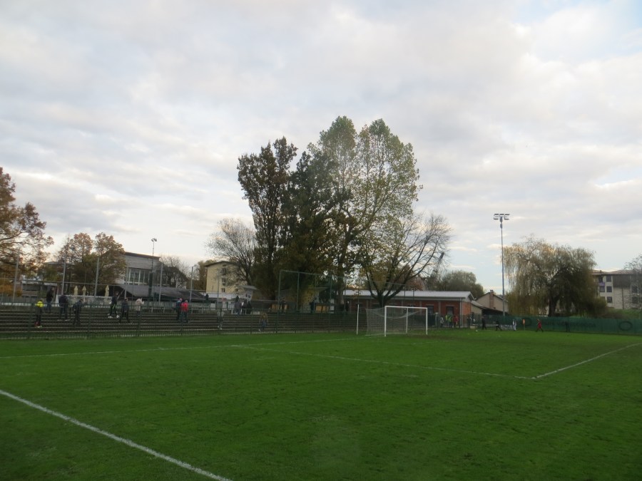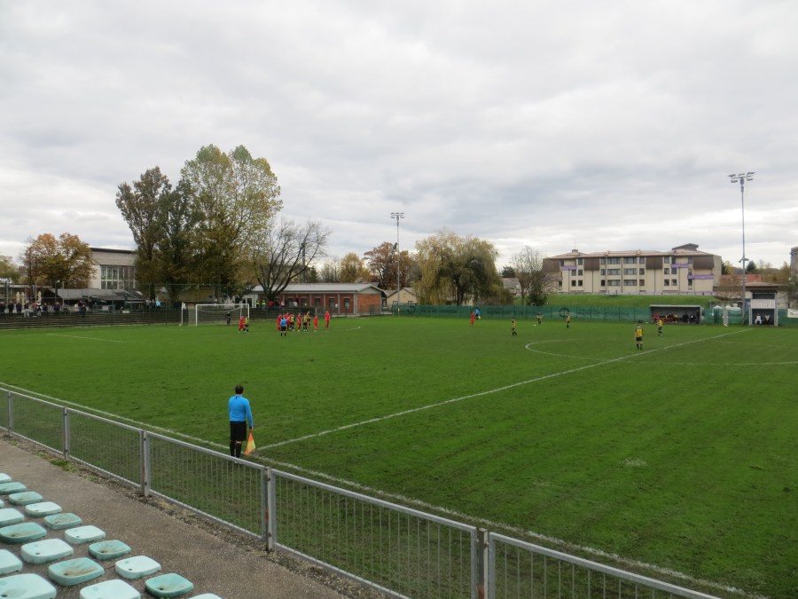 Am Samstagnachmittag beförderte ich dieses Spiel aus den Tiefen von Soccerway hervor. In der dritten slowenischen Liga trafen Svoboda und Brinje-Grosuplje aufeinander. Auf beiden Webseiten der Vereine erkannte ich das Wort derbi, aber den genauen Spieltermin konnte ich nicht verifizieren. So ging es mit einiger Unsicherheit zu Fuß in einen Ljubljaner Vorort. Kurz vor Anpfiff erreichten wir das Stadiongelände und seufzten erleichtert. Der Kick findet statt. Für drei Euro durften wir das Stadion betreten. Ich hatte keine großen Erwartungen, aber für dritte slowenische Liga war hier ordentlich etwas los. Ungefähr 250 Zuschauer waren am Ende da, wobei sich die Sympathien etwa die Waage gehalten haben dürften.