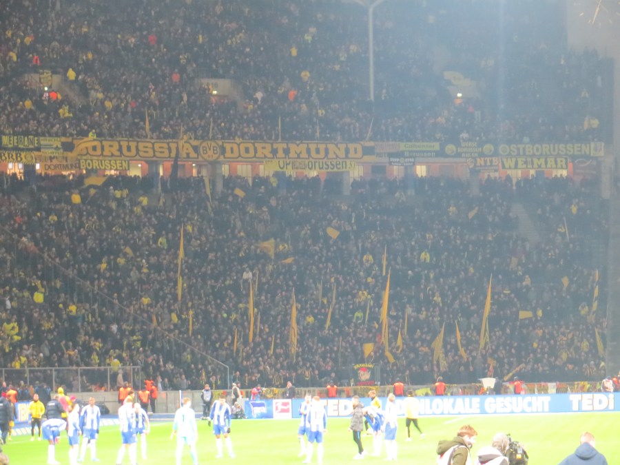 Für mich endete die Nacht zu einem erstaunlich zivilisierten Zeitpunkt. Da auch mit der Bahnverbindung absolut alles glatt lief, erreichte ich gegen 13:00 die Berliner Stadtgrenze. So hatte ich sogar noch Zeit, um meine Sachen in meinem Nachtquartier abzulegen und eine Kleinigkeit zu essen. Gegen 14:00 erreichte ich dann das Stadion und half beim Aufkleberverkauf, der heute erstaunlich gut verlief. So konnten wir gegen 15:00 schon einpacken und zügig in die Kurve hinunterlaufen. Gerade die unteren Bereiche waren heute gut gefüllt. Zum einen lockte mit Borussia Dortmund ein sehr attraktiver Gegner. Zum Anderen war eine ganze Busladung Karlsruher vor Ort, die nach ihrem Spiel am Vorabend nun die Hertha unterstützen wollten.