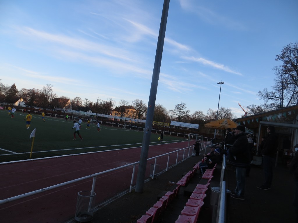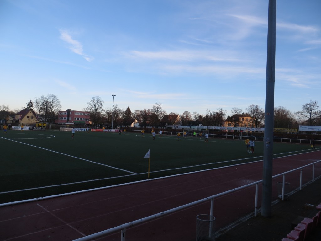 Kurze Zeit später saßen wir in der U-Bahn nach Rudow. Aufgrund einer kurzen Verzögerung durch ein Aufhalten der Tür wurde direkt mal der Genickschuss und die Wiedereinführung der Todesstrafe gefordert. Liebe BVG, ich hätte da noch ein paar Menschen für Euer nächstes kesses Video! Kurz vor der Endstation stiegen wir aus und nahmen noch einen Café ein, bevor wir die Straße überquerten und das Stadion betraten. Ja, nennen wir es einfach mal Stadion, denn verkehrt war das nicht. Auf der einen Seite gab es eine ordentliche Anzahl von Stufen und auch sonst hatte man sich mit der Anlage Mühe gegeben. Zwar wurde auch hier auf Kunstrasen gespielt, aber sonst war das nett.