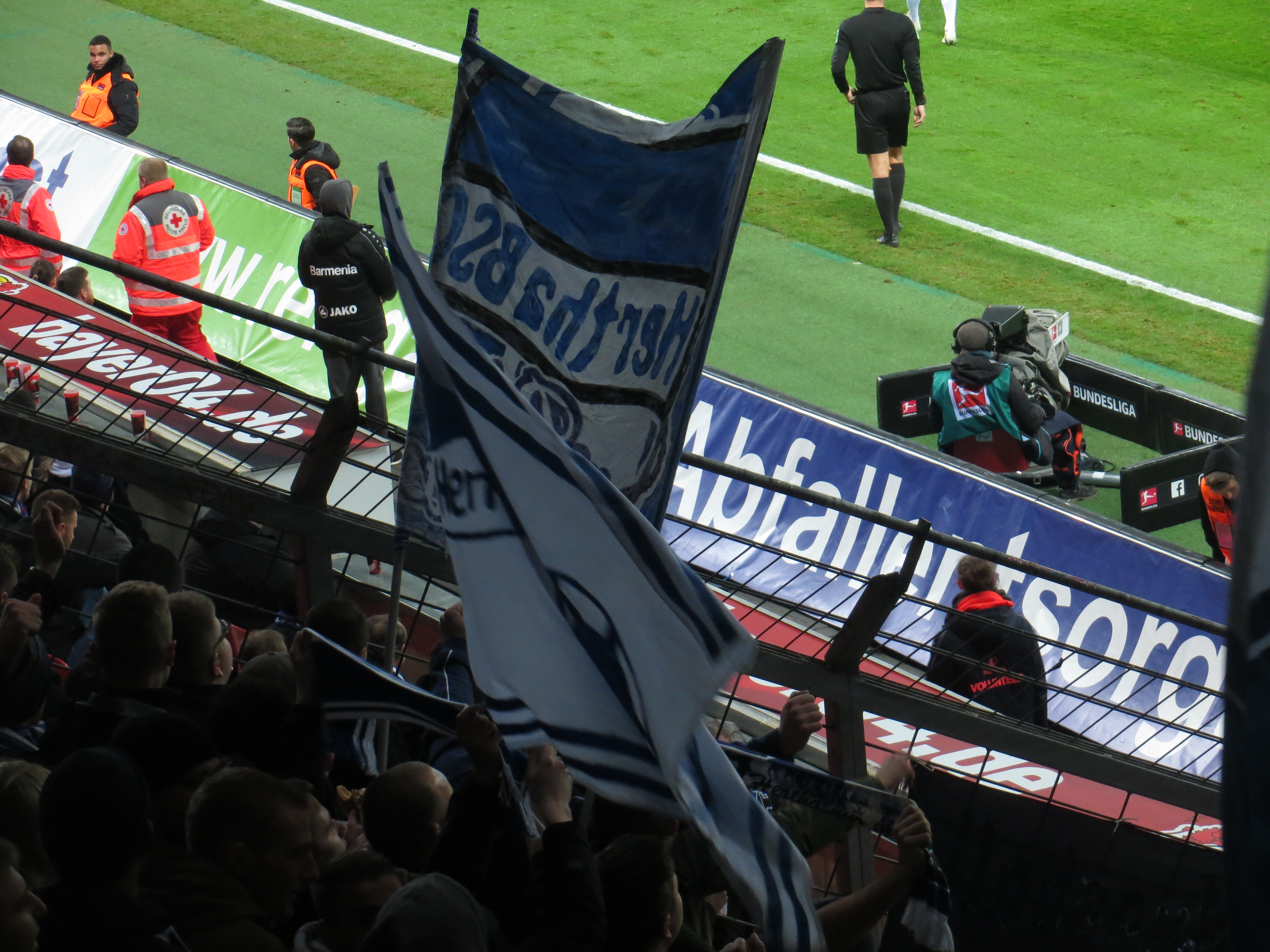 Gemeinsam ging es dann zur ungefähr zwanzigsten Minute in den Block. Ehe die Fahnen komplett aufgebaut waren, war dann fast die 30. Minute erreicht. Zu Beginn der Saison war mir vor diesem Auswärtsspiel Angst und bange. Heute war ich dann sehr erstaunt. Gut und gerne 1.100 Herthaner waren am Start. Somit vielleicht sogar mehr, als beim Gastspiel am Samstag im letzten Jahr. Die Stimmungshoheit ging dann auch ganz klar an uns. Ein guter und geschlossener Auftritt mit vielen Highlights. Zu Beginn der zweiten Halbzeit starteten wir mit dem einfach geilen „Die Zeit vergeht“ Lied. Auch wenn hier nicht der ganze Block mitzog, machte das einfach Spaß. Am Ende die Spitzen gegen Leverkusen waren auch sehr unterhaltsam. Ein richtig schöner Abend!