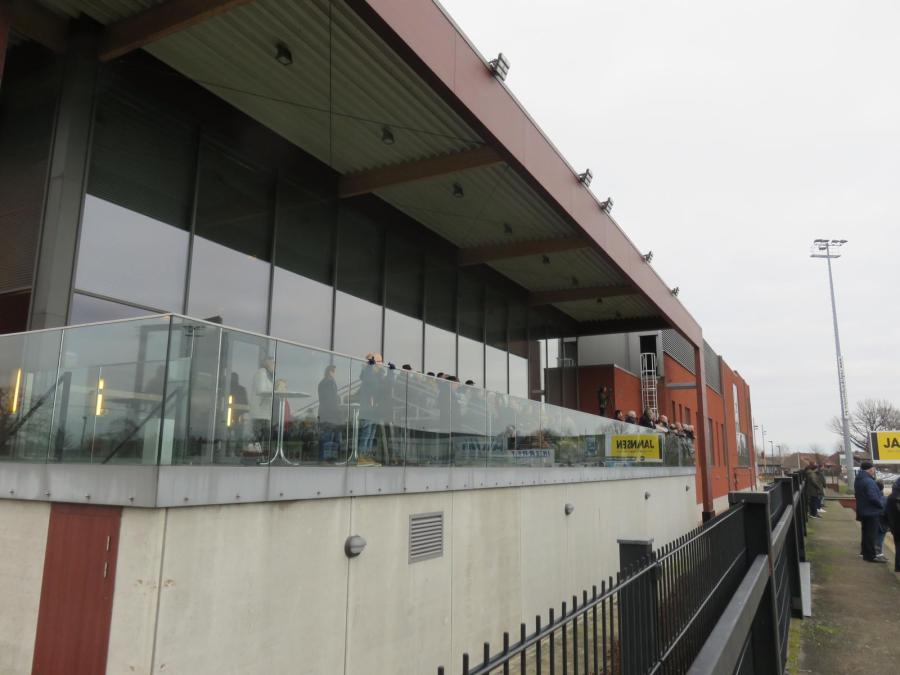 Der Eintritt war mit 10 Euro eher sportlich und das Stadion war komplett mit Werbung tapeziert. Ansonsten gab es hier aber heute gar nichts zu meckern. Wir vertrieben uns die letzten Minuten bis zum Anpfiff im sehr schönen und vor allem warmen Vereinsheim, das mit günstigen Preisen aufwarten konnte. Gespielt wurde auf Naturrasen und auch das Zuschauerinteresse war mit knapp 280 Leuten durchaus beachtlich. Neben der Tribüne gab es auf der gegenüberliegenden Seite noch einige Sitze für die VIPs des Orts. Das sah wie bei einem Pferderennen aus.