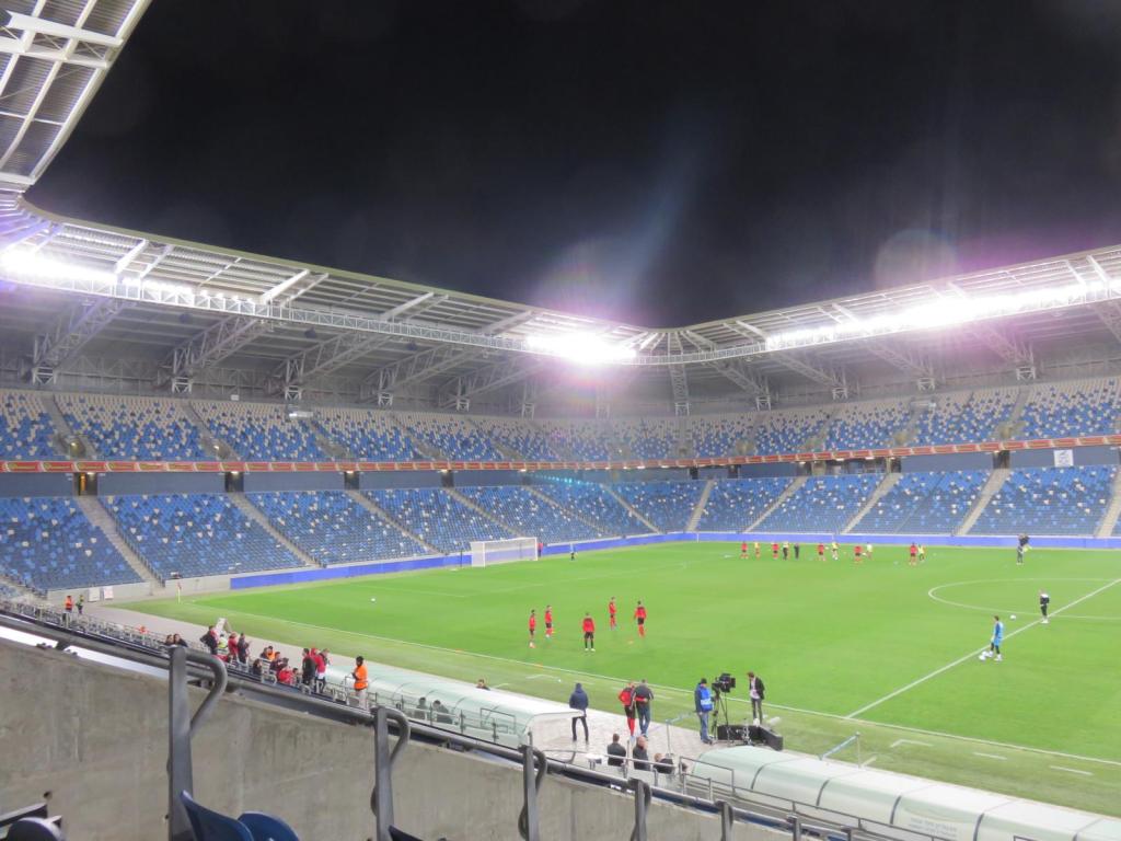 Ich wurde dann direkt von einem Golddigger abgefangen, der auch eine Karte haben wollte und mich nach möglichen Verwandschaftsgraden zu Spielern fragte. Tzz. Ich betrat triumphierend das Stadion und staunte über die elegant übersetzte Frage: „Do you weapons?“. Ja, moin. Ich nicht weapon und so kam ich herein und stellte fest, dass im Stadion noch absolut gar nichts los war. 30 Minuten bis zum Anpfiff vergingen somit nur quälend langsam trotz einiger guter Ideen, die ich dann auch in die Tat umsetzte.