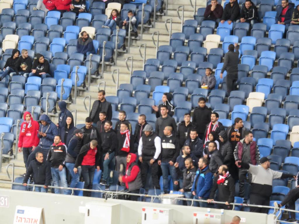 Die Stimmung zwischen beiden Mannschaften und Fangruppen war jedoch absolut entspannt. Die Gäste wurden von erstaunlich vielen Fans begleitet. Etwa 30 Leute supporteten das gesamte Spiel und wussten mit unbekannten Melodien zu gefallen. Im Oberrang hing eine recht große Ultras Fahne. Die Heimfans von Hapoel waren auf der Geraden und fielen absolut nicht weiter auf. Das war schon etwas enttäuschend.