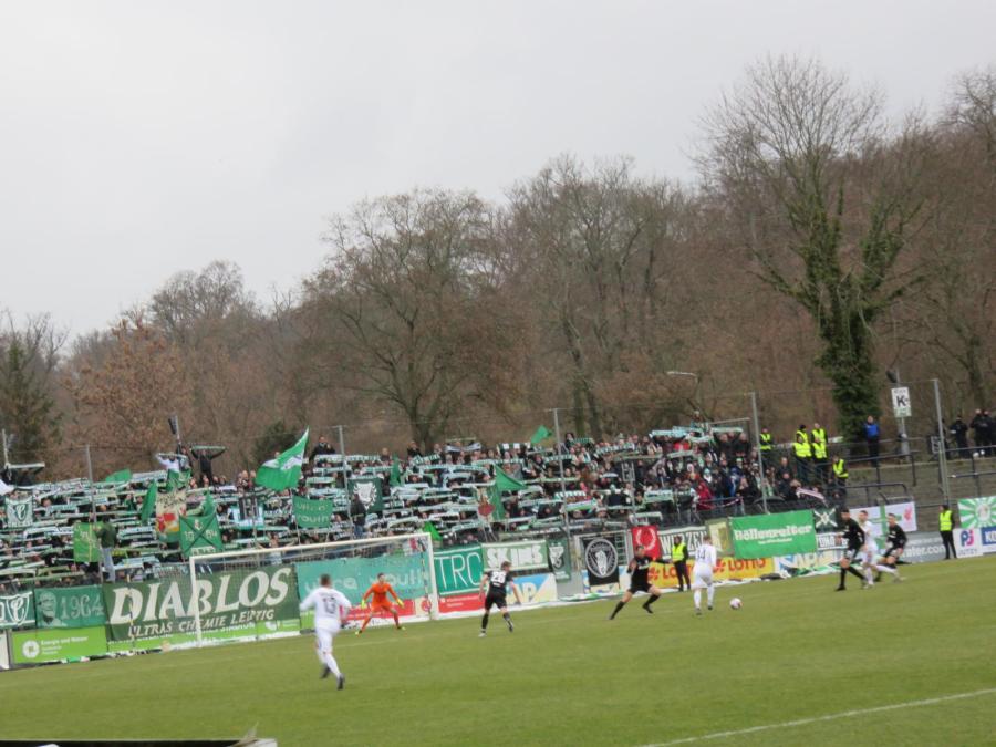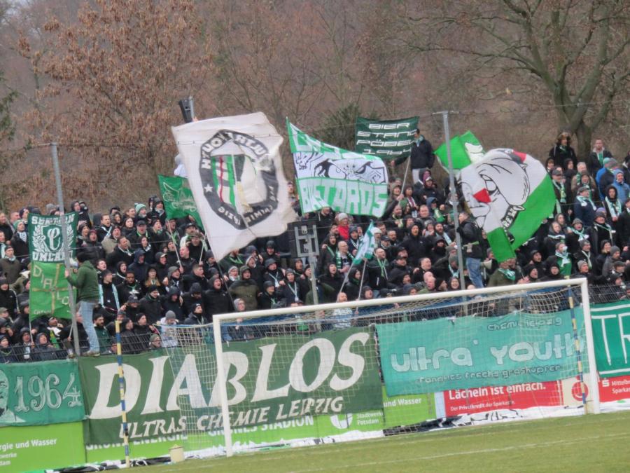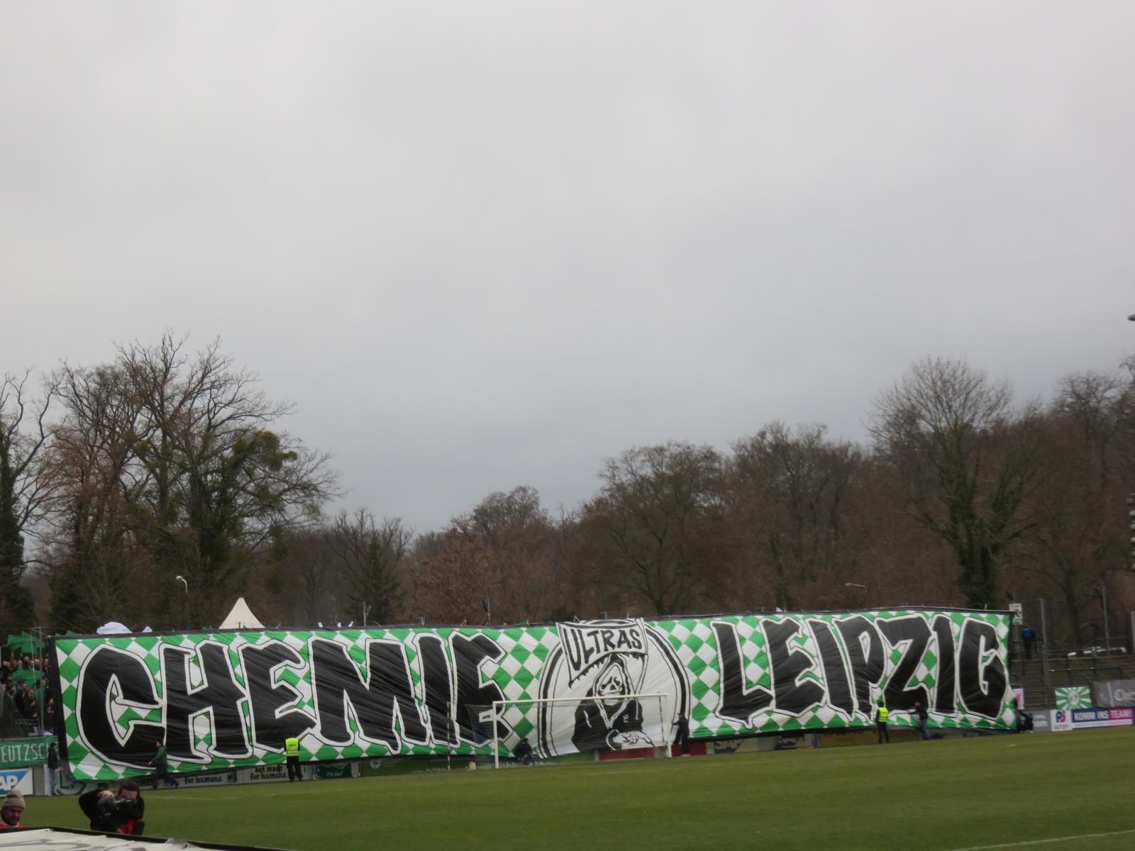 Chemie startete ansonsten mit einem wunderschönen Intro in die Partie. Per Seilkonstruktion wurde eine riesige Blockfahne aufgespannt. Neben dem Namen des Vereins war in der Mitte ein Sensemann mit einem „Ultras“ Schriftzug zu erkennen. Das sah richtig gut aus. Nachdem die Blockfahne heruntergelassen wurde, erschien ein grün-weißes Fahnenmeer. Eine richtig tolle Aktion. In der Folge wussten die Gäste durch geschlossene Hüpfeinlagen und schöne Gesänge zu überzeugen. Ganz so stark, wie beim letzten Spiel war das heute nicht, aber für eine Regionalligaszene fast schon unwirklich. Stark, Chemie! Nach dem Spiel rannten noch ein paar Chemiker an den Zaun, um den Babelsbergern ihre Meinung in Bezug auf Frahn mitzuteilen.