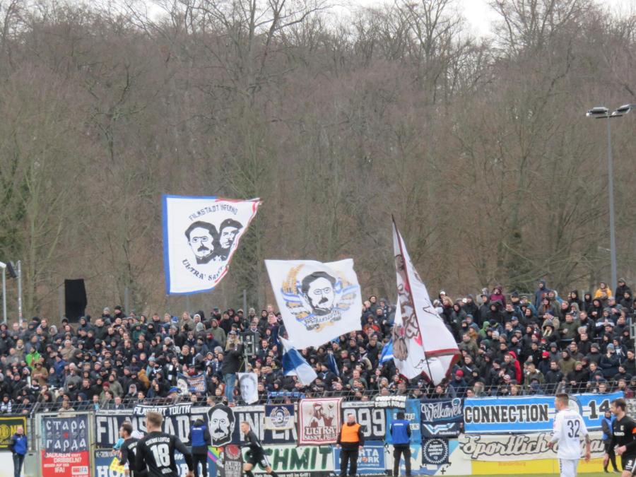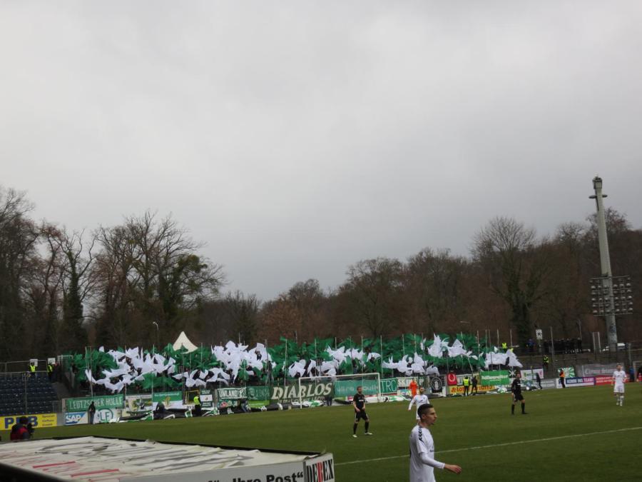 Auch durch die Entscheidung der Underdogs die Nordkurve zu verlassen, wird man im Karli mittlerweile von drei Seiten beschallt und man dreht den Kopf nur hin- und her. Das war heute nicht der stärkste Auftritt der Babelsberger. Filmstadtinferno und die Underdogs erwischten beide nicht ihren stärksten Tag und so blieb es über weite Strecken eher leise. Die Zahl im Umfeld der Underdogs scheint jedoch immer noch langsam, aber doch sicher zu steigen. Fokussiert wurde sich auf den Klassenerhalt, was in Form etlicher Zaunfahnen deutlich gemacht wurde.