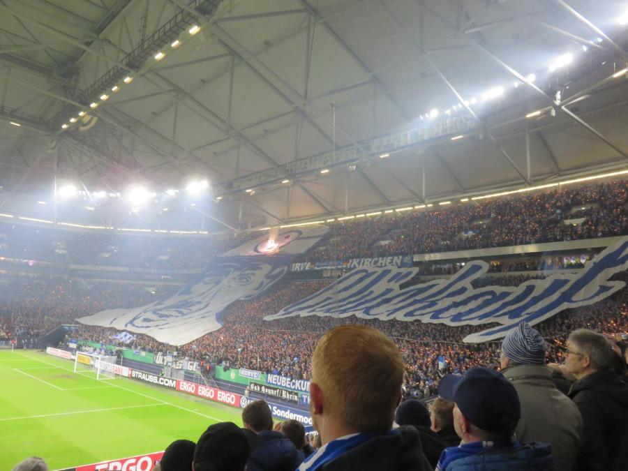 Schalke startete mit einer schönen Choreo in die Partie. Neben einem großen Schriftzug „Glückauf“ wurde ein Bergmann gezeigt. Die Stirnlampe wurde durch bengalische Fackeln zum Leuchten gebracht. Dazu gab es unzählige Wunderkerzen in der Gelsenkirchener Nordkurve. Sorgte für ein optisch schönes Bild. Für mich trotzdem unverständlich wie dieser Bergbaukult immer weiter zelebriert werden muss. Das kann man wahrscheinlich nicht verstehen, wenn man nicht aus der Region kommt, aber mir geht das einfach auf den Keks. Mittlerweile wird Gelsenkirchen sicher mehr von Shishacafés, als vom Bergbau geprägt. Warum nicht das einfach mal zum Thema einer Choreo machen? Shishastadt GE und rauchende Pfeifen stelle ich mir auch sehr schön vor.