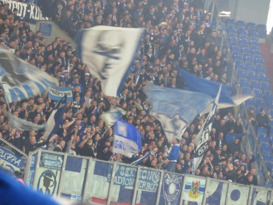 Ich lief dann zum Gästeblock und kam heute endlich mal entspannt in die Turnhalle, dessen Dach mal wieder geschlossen war. Dann runter in den Block und die Freude weitere Unverbesserliche zu sehen, war auch wirklich groß. Außerdem war der Block wesentlich voller, als beim Ligaspiel am Samstagabend. Fast 2.000 Herthaner bevölkerten zu dieser fanunfreundlichen Anstoßzeit unseren Bereich.