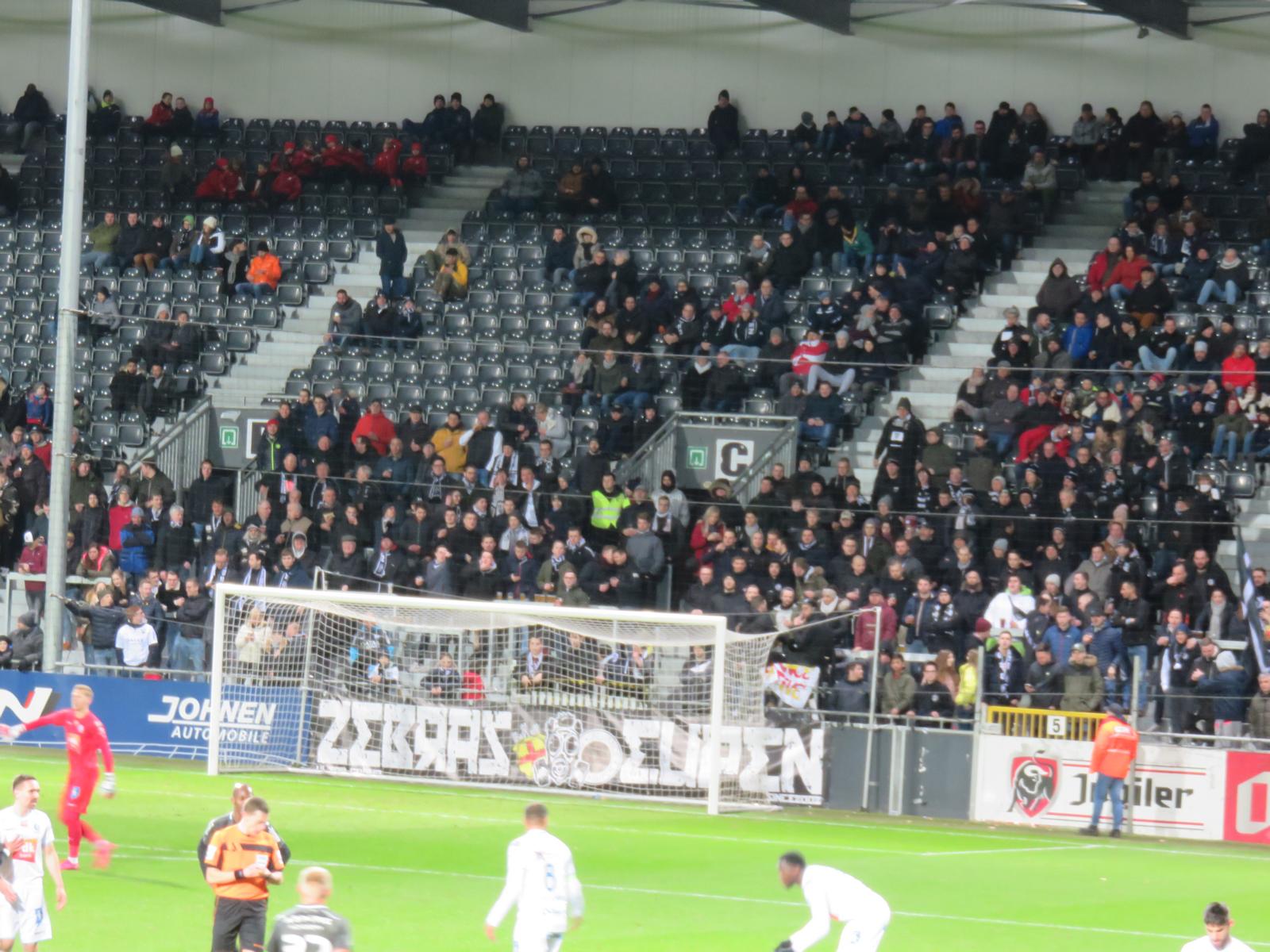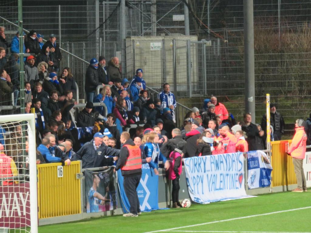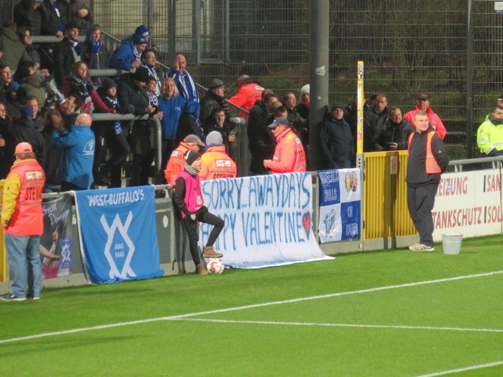 Von beiden Fanlagern war das heute ein Auftritt ohne Aufreger. Circa 200 Leute unterstützen hinter einer „Zebras Eupen“ Zaunfahne die Heimmannschaft. Bei Gent waren es vielleicht 150 Leute. In Erinnerung blieb dabei der Lappen, der den zu Hause gebliebenen Liebschaften Grüße ausrichtete und mitteilte, dass es leider keinen Valentinstag geben würde, da eine Auswärtsfahrt anstünde. Kann man so machen.