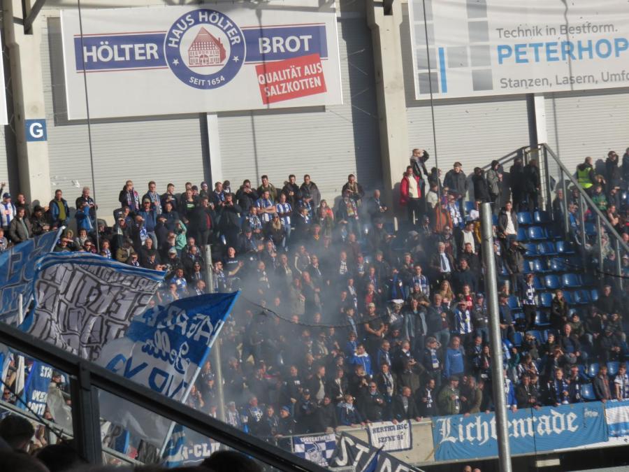Auf der gegenüberliegenden Seite bemühten sich circa 100 Leute hinter der Supporters Paderborn Fahne um die Unterstützung ihrer Mannschaft. Einige Male klatschten die anderen Tribünen mit, ansonsten kam bei uns nicht wirklich was an.