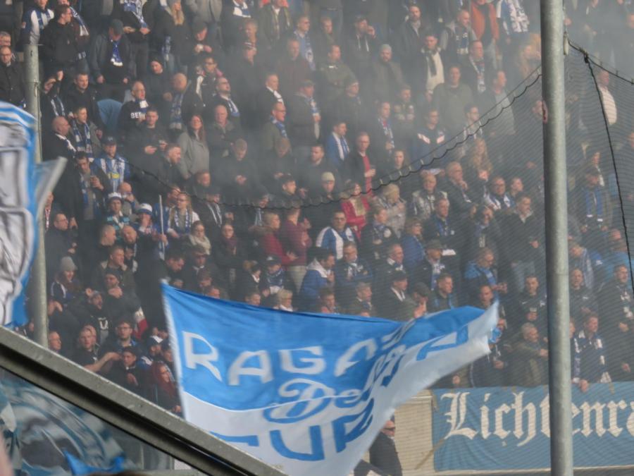 Direkt nach dem Eingang lief ich in Tschernie und Nemo, die wie viele andere Herthaner die kurze Fahrt als Einladung für viele Getränke genommen hatten. So war die Stimmung im Block ausgelassen und wir kamen gut in die Partie. Der Support war jetzt lautstärketechnisch sicher nicht überwältigend, aber er passte einfach zum Tag. Optisch wurde hingegen einiges geboten. Wir läuteten die Partie mit einem schönen Intro bestehend aus blau-weißen Fahnen, Konfetti und Kassenrollen ein. Im Vordergrund der Aktion wurde die Zaunfahne: Wir wollen Fußball ohne Millionäre präsentiert. Im weiteren Verlauf der Partie wurden immer mal wieder einzelne Fackeln gezündet, die den Support untermalten und anheizten. Ich bin ein großer Fan dieses Einsatzes von Pyrotechnik.
