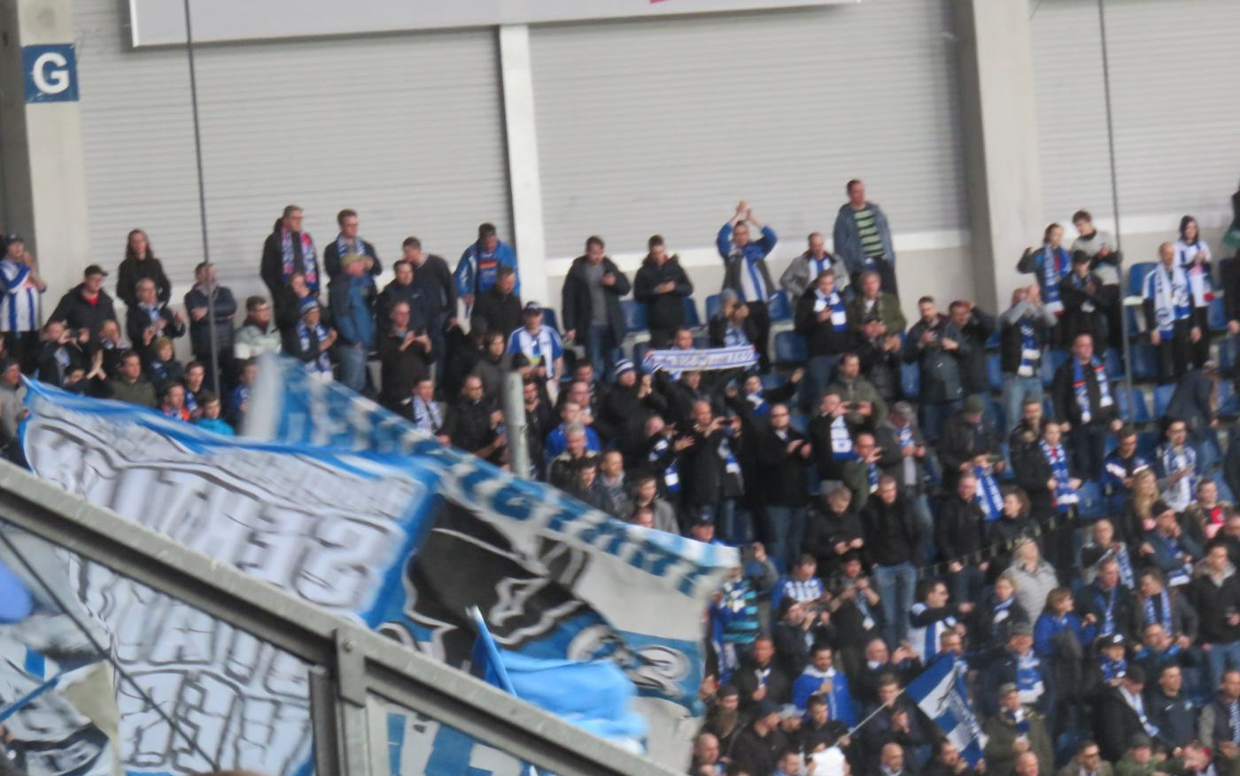 Auf der gegenüberliegenden Seite bemühten sich circa 100 Leute hinter der Supporters Paderborn Fahne um die Unterstützung ihrer Mannschaft. Einige Male klatschten die anderen Tribünen mit, ansonsten kam bei uns nicht wirklich was an.