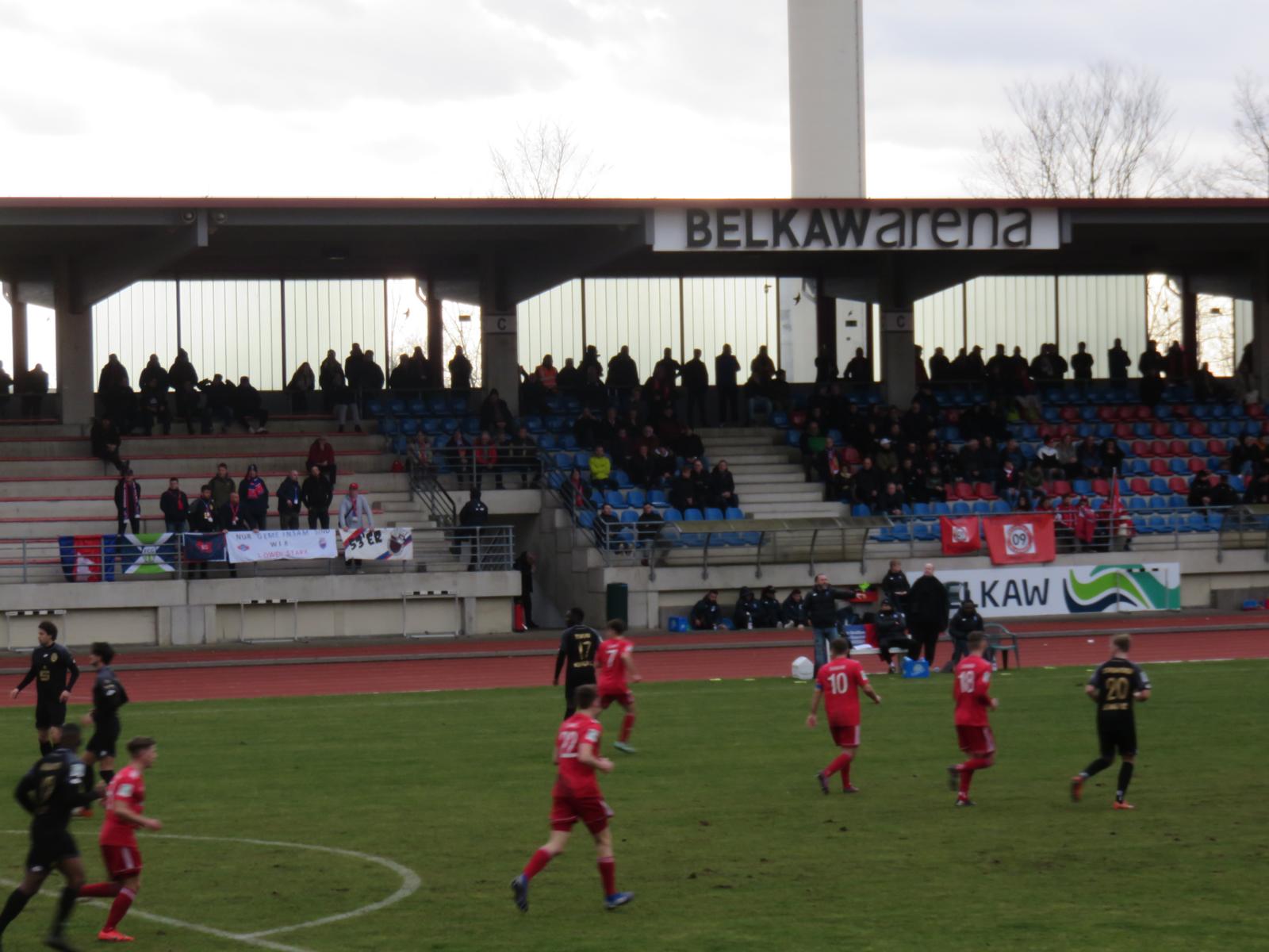 Ganz gediegen wurden wir heute mit dem Auto nach Bergisch Gladbach gebracht und durchquerten dabei einige Außenbezirke Kölns, die eher nach Ruhrpott, als nach Rheinland aussahen. Zügigen Schrittes legten wir die letzten Meter bis zum Einlass zurück und erreichten mit dem Anpfiff die Traversen. In der ersten Halbzeit nahmen wir auf den Stehplätzen Platz. In der zweiten Halbzeit wechselten wir dann auf die große und überdachte Haupttribüne.