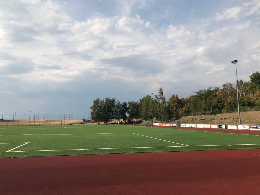 Wir erreichten jedoch überpünktlich den Sportplatz und staunten das erste Mal am Eingang, als wir an ausgesonderten Bällen des Sportvereins vorbeiliefen. So wechselte ein super Ball in unseren Besitzstand und wir hatten in der Folge keine Beschäftigungsprobleme mehr. Aufgrund der Hitze liefen wir direkt zum Getränkestand und füllten die Flüssigkeitsreserven wieder auf. Ein vielfältiges Angebot, nette Leute- so muss ein Vereinsheim auf so einem Platz sein.
