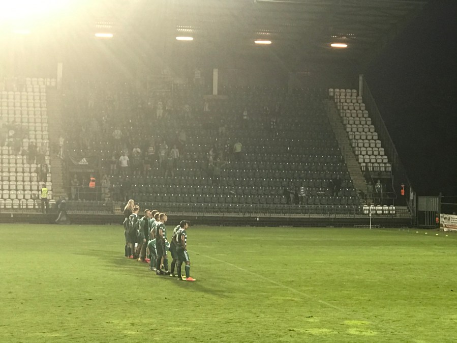 Die Fans der Bohemians starteten mit einer sehenswerten Choreo in die Partie. Zunächst wurde eine Blockfahne hochgezogen, auf der das Vereinswappen und ein sonnenbebrillter Fan der Heimmannschaft zu sehen war. Im Anschluss wurden zahlreiche grüne Rauchtöpfe gezündet, was ein wirklich wunderbares Bild abgab. Im Anschluss wurde die Mannschaft 90 Minuten supportet und große Teile des Stadions stiegen immer wieder in die Gesänge ein. 3-4 Schwenkfahnen waren konstant in der Luft und in der Kurve waren auch einige Zaunfahnen zu finden. Kurzum: Es war fast so wie früher. Wir saßen entspannt auf der Geraden und wippten bei den Gesängen der Bohemians mit. Es war sehr schwer bei diesen Eindrücken nicht völlig ekstatisch zu werden. Die Zeit nach Corona wird intensiv!