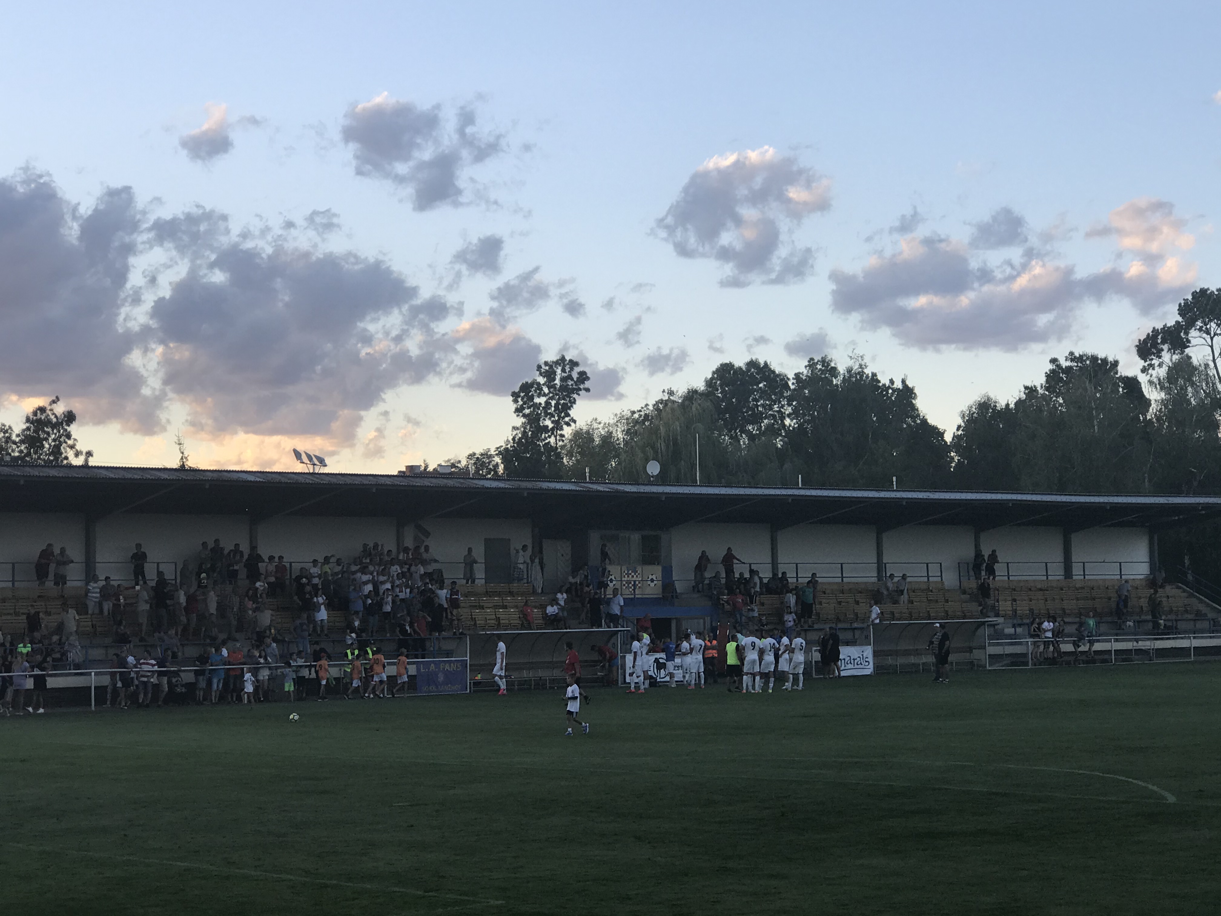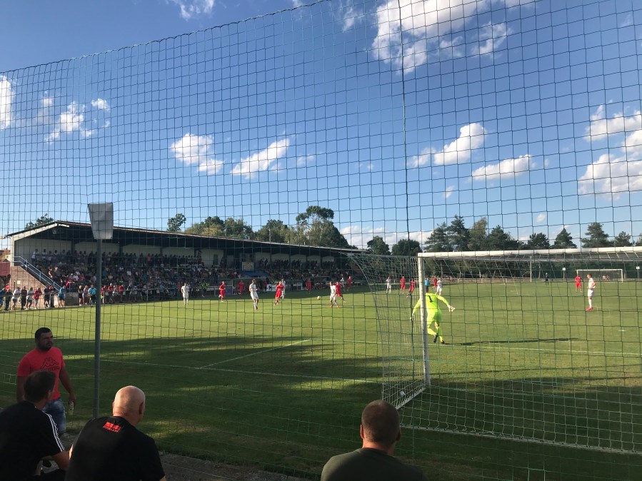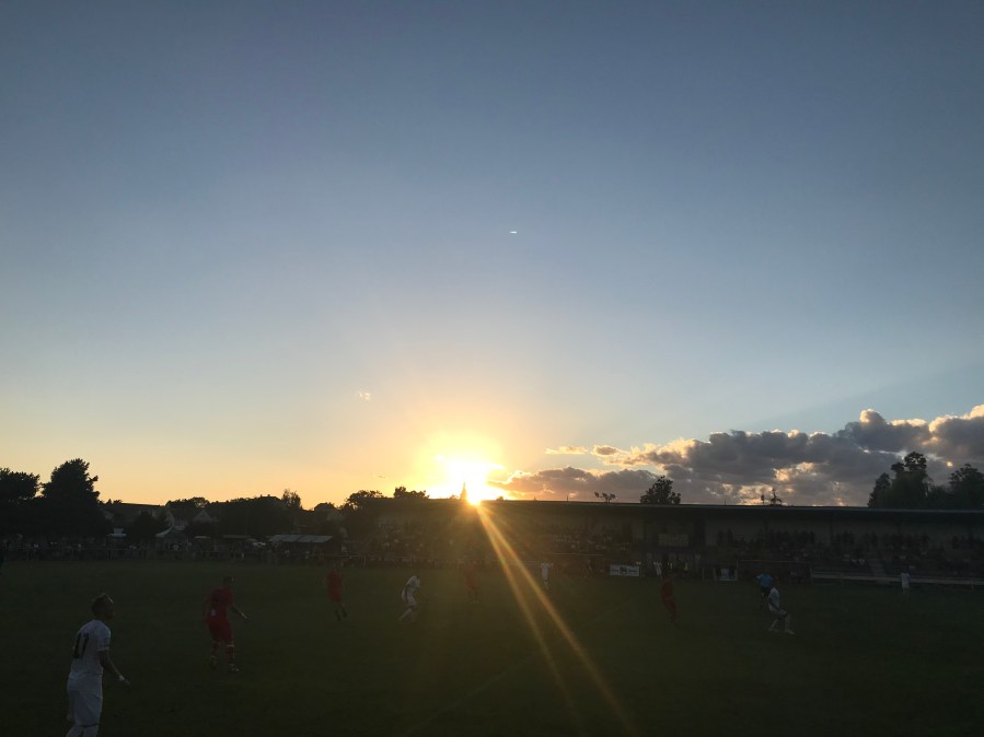 Dadurch kamen wir fast pünktlich auf den Sportplatz und wieder durchfuhren Glückshormone meinen Körper. Der Amateurfußball in Tschechien lebt einfach. Am Sportplatz war richtig Alarm und circa 500 Leute fieberten bei diesem Pokalspiel mit. Die eine ausgebaute Seite punktete durch eine sehenswerte Tribüne und auf den anderen Seiten konnte man es sich auf einigen Hügeln bequem machen. Dank des guten Wetters fläzten wir uns motiviert in die Abendsonne und genossen dazu ein kühles Pivo. In der Halbzeit genoss ich dann noch eine Klobasa und war vollständig im Fußballhimmel angelangt.