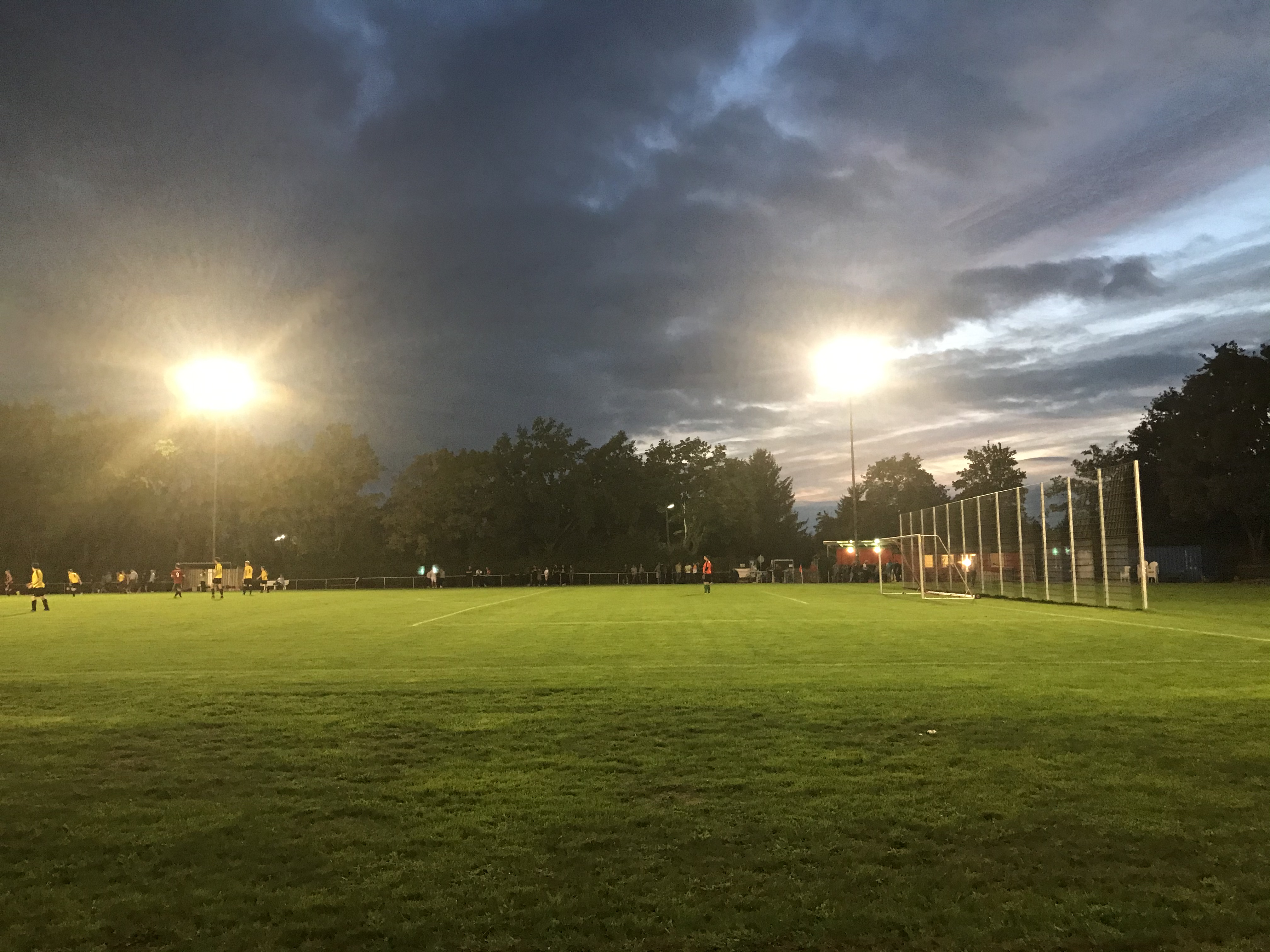 Nach einem schönen Spaziergang durch einen Stadtwald, erreichten wir den Sportplatz in Lengsdorf. Hier wird erfreulicherweise noch auf Rasen gespielt, was heutzutage ja schon etwas Besonderes ist. Die zweite Pokalrunde lockte die Bonner hinter ihrem Ofen hervor und so bildete sich am Eingang eine veritable Schlange. Durch die Nachverfolgung der Kontakte, dauerte die Einlassprozedur recht lange und so ertönte schon der Anpfiff, während wir vor dem Tor standen. War nicht weiter wild, denn man konnte einwandfrei das Spielfeld erkennen.
