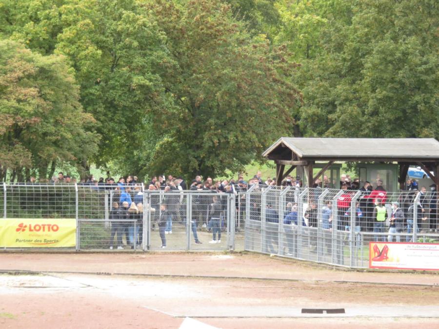 Das Stadion war ein wirklicher Hingucker. Es gab eine schön ausgebaute Tribüne und ansonsten Stehplätze zu allen Seiten. Für dieses Spiel wurden 1.200 Personen zugelassen und diese Schwelle wurde erreicht. Das lag auch an den zahlreichen Trierern, die zu diesem Spiel reisen durften. Ich hatte vorher noch die Stellungnahme von Insane Ultra gelesen. In dieser kommunizierten sie, dass sie nicht als Gruppe im Stadion auftreten würden. Daher war ich schon überrascht, dass bestimmt 100 Personen unter lauten Gesängen am Stadion ankamen.