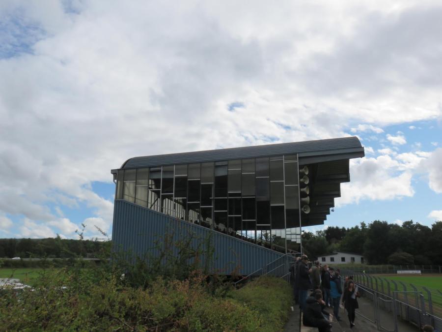 Gegen 14:30 erreichten wir zeitgleich mit Röller das Stadion. Das Wort Regen war ihm ein Begriff, aber erlebt hatte er davon nichts. Mit seinen ersten Schritten in Salmtal wagte sich die Sonne hinter den Wolken hervor und bestrahlte unsere Gesichter. Verrückt! Wir holten unsere hinterlegten Karten ab und genossen dann vor den Stadiontoren erst einmal das Leben. Eine Rindswurst, Pommes, Kuchen und Kakao ließen die Stimmung förmlich explodieren. Wir wählten erst den falschen Eingang und fanden dann aber ein schönes Plätzchen auf der Stehplatztribüne.