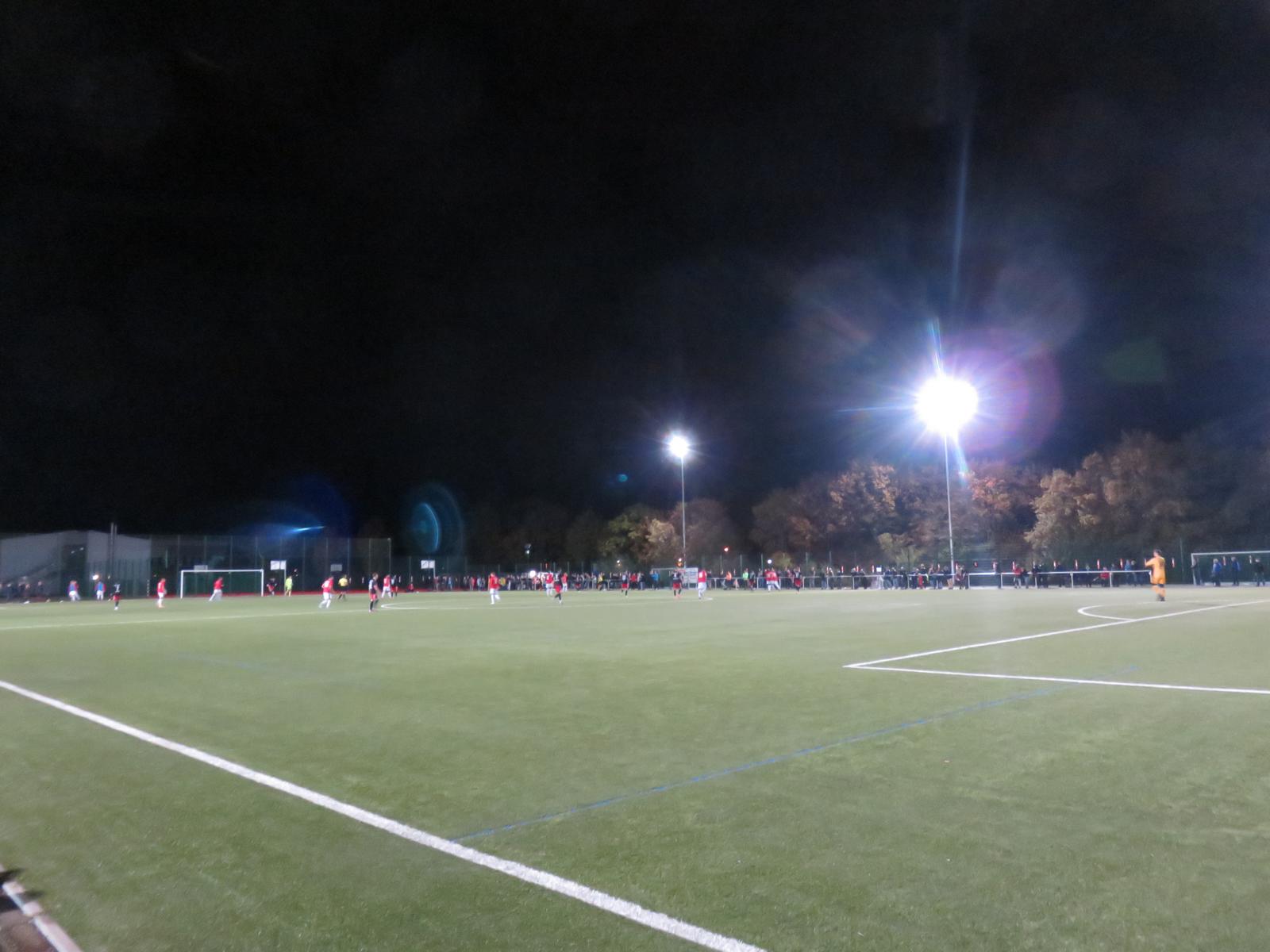 Wir hatten uns eine schöne Weinstube ausgesucht und aßen und tranken dort noch vorzüglich, ehe wir die letzten Meter zum Stadion zurücklegten. Röller, die alte Hopperlegende war wie immer am schnellsten und bemerkte das im Dunkeln liegende Stadion. Zwei Kaiserslauterinnen, die zeitgleich mit uns am Parkplatz ankamen, klärten uns auf das das Spiel auf dem anliegenden Kunstrasenplatz stattfinden würde. Lange Gesichter bei ¾ der Beteiligten, da das Stadion wirklich sehenswert gewesen wäre. Der heimliche Gewinner des Abends war Röller, der auf diese Weise einen neuen Ground kreuzen konnte.