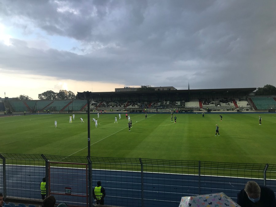 Ich hatte großmundig auf meine Regenjacke verzichtet und wurde mit dem einsetzenden Regen bestraft. Da es nur wenige Möglichkeiten gab sich unterzustellen und diese somit zu Corona-Hotspots mutierten, hieß es hier auf die Zähne beißen und dem Regen zu trotzen. So hatte man neben dem Spiel auch noch die Möglichkeit den Himmel zu beobachten und ein baldiges Ende des Regen zu prophezeien.