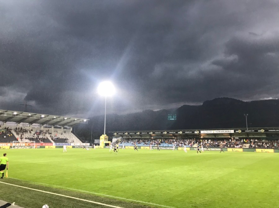 Ganz wohl war mir bei der Sache nicht und ich bin mir nicht sicher, ob ich es selbst übers Herz gebracht hätte, in der Kurve zu stehen. Wir verbrachten am Spieltag einen wunderschönen Tag am Bodensee und bezwangen zu Fuß den Pfänder. Recht kurz vor Anpfiff, parkten wir unseren Mietwagen dann in Altach und verabschiedeten uns für die 90 Minuten von 50% unserer Reisegruppe. Aufgrund der unproblematischen Einlasssituation hatten wir 10 Minuten vor Anpfiff bereits unsere Plätze eingenommen. Prompt schallten auch schon die ersten Gesänge durch das Stadion.
