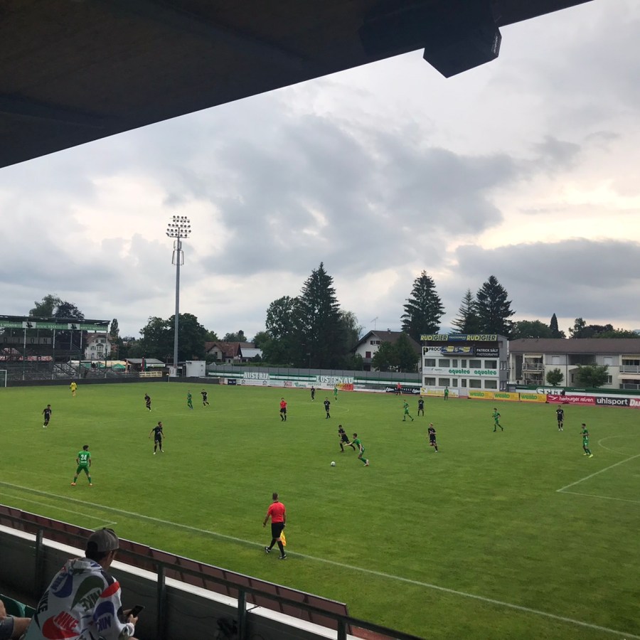 Nach einem kleinen Spaziergang und einem kleinen Mittagsmahl, liefen wir auch schon wieder zum Stadion, um das Spiel der Zweitvertretung von Lustenau zu besuchen. Den Einlass umkurvten wir mit der Begründung „Wir waren schon drin“, was stimmte und funktionierte. Das Stadion war noch gut gefüllt, wobei es sich ein Großteil der Besucher im hinteren Bereich der Bierbänke bequem gemacht hatte. Dort gab es zahlreiche Verpflegungsstände und man konnte zu soliden Preisen mit seinen Freunden die Zeit verquatschen. Wir nahmen wieder unseren Platz an der Bande ein und freuten uns auf das Spiel in der Eliteliga Voralberg. Diese ist mehrgleisig und die vierthöchste Liga in Österreich.