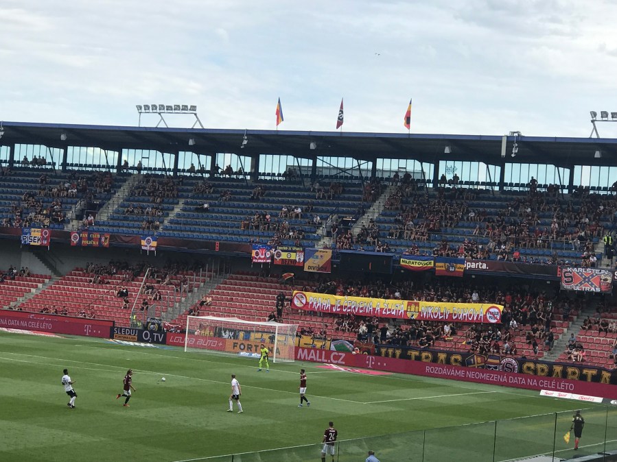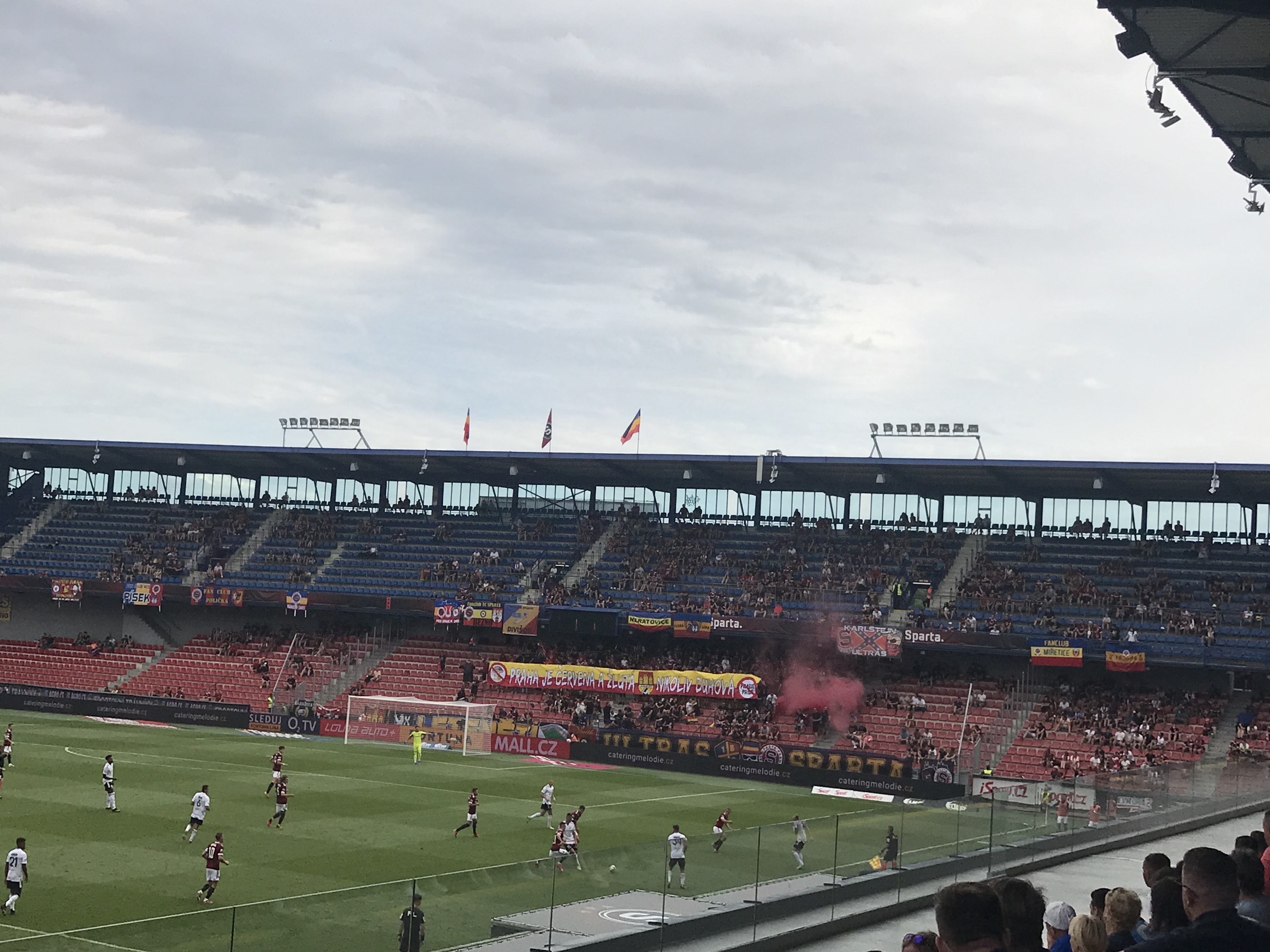 Das Stadion war mit circa 5.000 Zuschauern eher spärlich gefüllt und ich fragte mich bis kurz vor Anpfiff ob es wirklich zu einem organisierten Support kommen würde. Die Fahne von den Ultras Sparta hing jedoch und mit dem Anpfiff ging es dann auch los. Unter der Woche kam es zu einem rassistischen Eklat gegen einen Spieler von Monaco und so waren meine Sympathien für Sparte sowieso nicht gerade groß. Circa in der 30. Minute wurde dann ein großes Spruchband im Block präsentiert. Dummerweise übersetzte ich synchron mit Google Translate und erhielt folgendes Ergebnis: „Prag ist blau-gelb-rot und nicht Regenbogen“. Dazu war ein „Praha Pride“ Logo durchgestrichen.