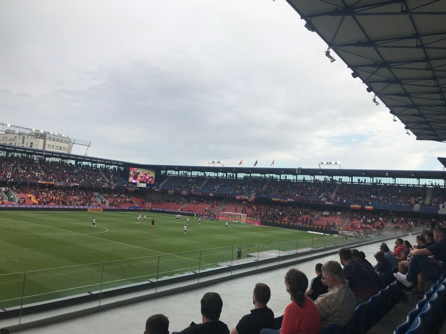 Circa 20 Minuten vor dem Anpfiff erreichten wir das Stadion von Sparta Prag und es zeichnete sich ab: Das geht heute gut. Relativ zügig erreichten wir auch den richtigen Eingang und auch unsere digitalen Tickets stellten keine größeren Probleme beim Einlass dar. Wir hatten uns zwei Tickets im Oberrang gekauft. Da jedoch direkt vor uns eine Pressetribüne aufgebaut war, hatte man von dort nur eine sehr eingeschränkte Sicht auf das Spielfeld. Also entschieden wir uns spontan um und setzten uns in den Unterrang, unmittelbar vor die VIP-Plätze. Das Personenkino war wirklich unterhaltsam und die Stadiontribüne glich hier eher einem Laufsteg.