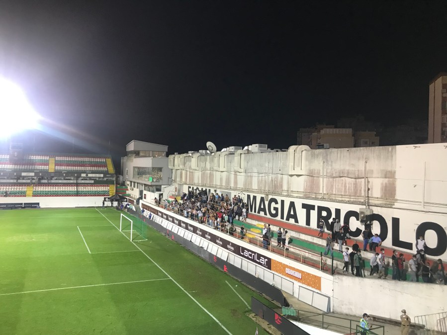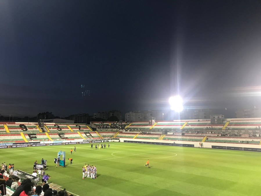 Nach drei Minuten knallte Estrela einen Freistoß an die Latte und konnte mit dem Nachschuss die 1:0 Führung erzielen. Das Stadion tobte. Leider wurde Rio Ave in der Folge seiner Favoritenrolle gerecht. Estrela kam noch zwei Mal zurück, aber Rio Ave hatte immer eine Antwort und gewann am Ende nicht unverdient mit 2:5. Das tat der Stimmung überhaupt keinen Abbruch und so versicherte die Kurve nach dem Spiel „Wir gehören zusammen“.