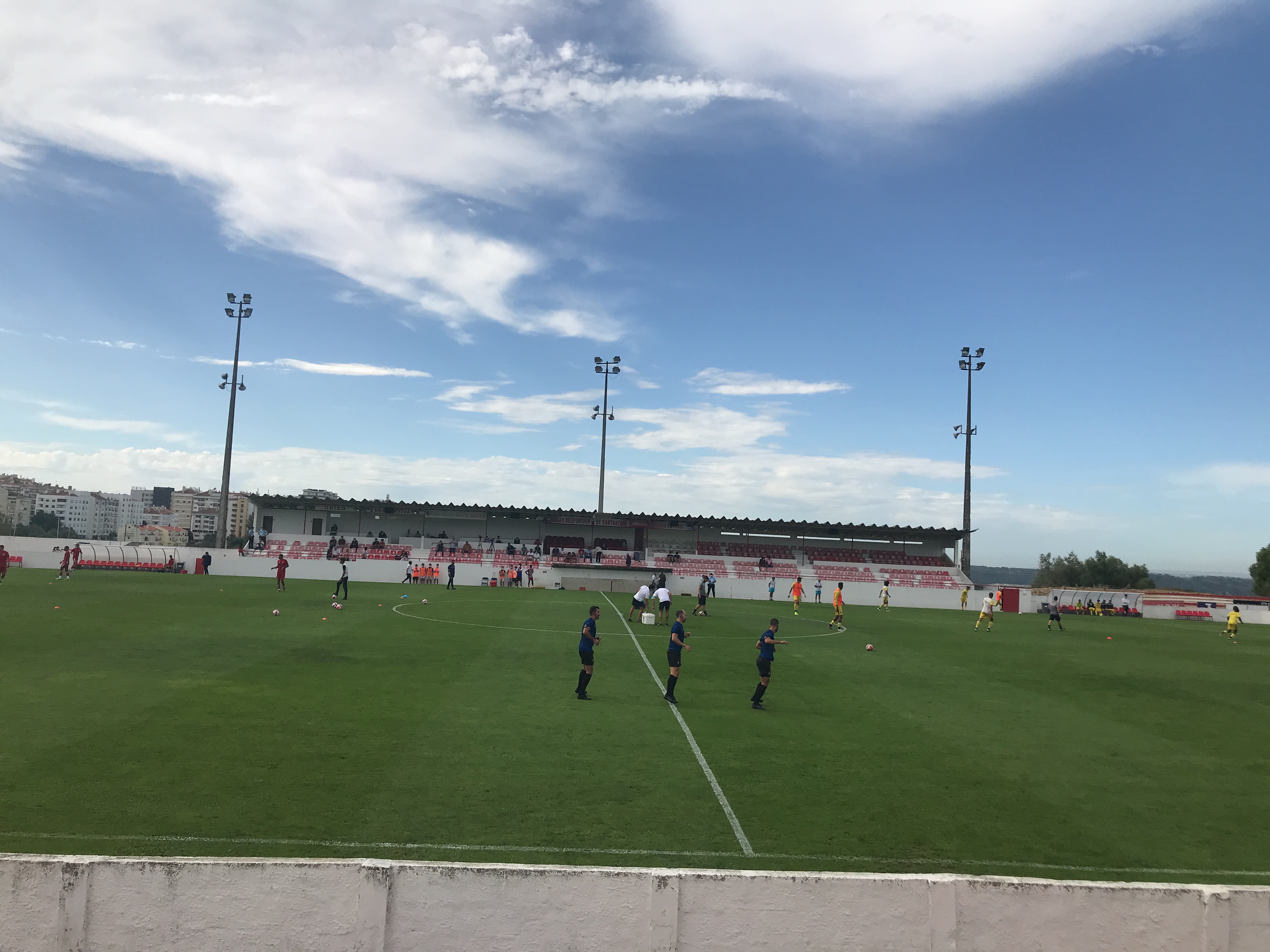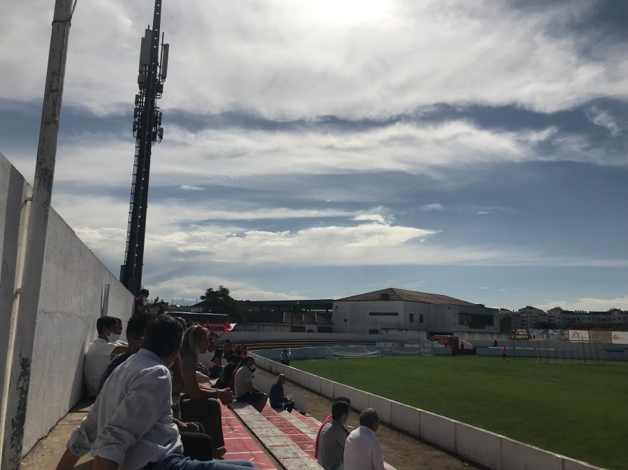 Der Morgen startete heute bedeckt und es gab sogar einen kurzen Regenguss. Mit der Kapuze im Gesicht, holte ich mir also mein Ticket und vertrödelte dann noch etwas Zeit mit einem kleinen Stadtspaziergang. Dann hörte ich in der Ferne zahlreiche Böller und sah die Fans von Santarém in einem Mini-Corteo zum Stadion laufen. Der Einlass ins Stadion verlief sehr entspannt. Es gab keinen Ordnungsdienst, sondern nur zwei Hostessen in Kleidern, die das Ticket kontrollierten. Ich nahm auf der Tribüne Platz und langsam, aber sicher verzogen sich die Wolken und die Sonne kam hervor.