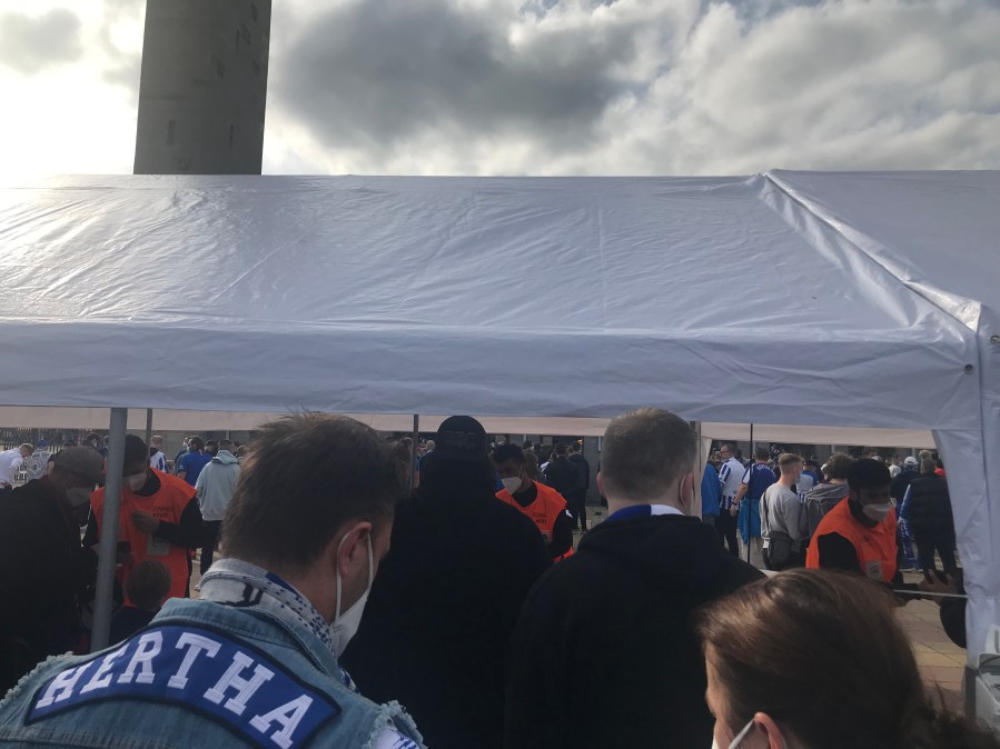 Die Atmosphäre ist bei den Teilzulassungen wirklich eine ganz andere. Alles ist irgendwie gedämpft und die Leute steigen nicht grölend aus der S-Bahn, sondern verlassen diese leise und gehen geordnet in Richtung Osttor. Dort gab es dann recht lange Schlangen an den Eingängen und ich war überrascht, dass man doch einige bekannte Gesichter erspähen könnte. Das Einlassprozedere war aber recht routiniert- die Impfpässe wurden sogar gescannt und überprüft und nach wenigen Minuten waren wir dann im Stadion. Vor der Ostkurve musste ich dann noch einmal schlucken. Hier würde man jetzt eigentlich die nächste Stunde verbringen und quatschen, ehe man dann die Kurve betritt. Mit einem wehmütigen Blick bog ich nach links, um zu unseren Plätzen für das heutige Spiel zu kommen.