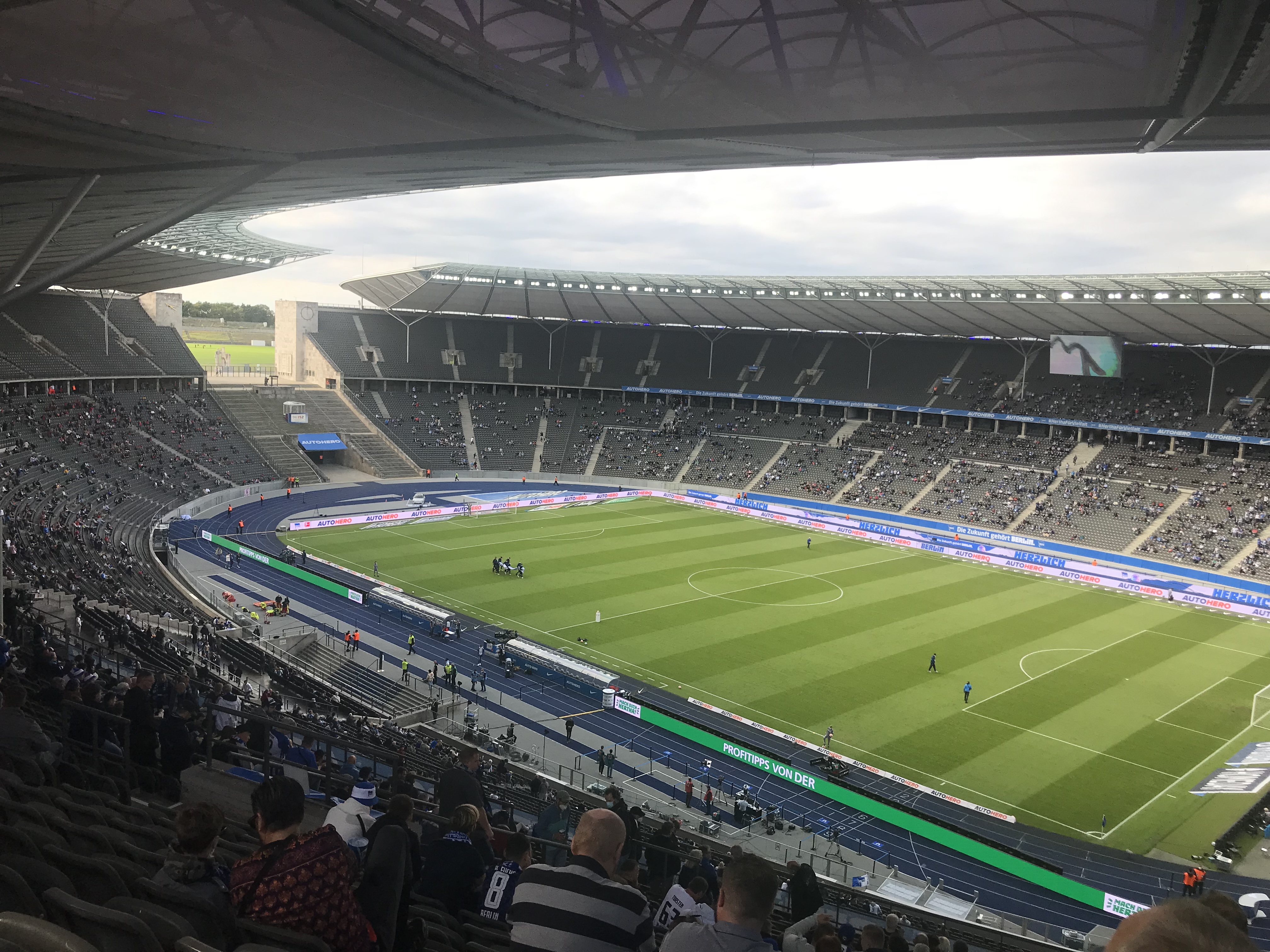 Diese befanden sich auf der Haupttribüne im Oberrang und boten mir noch einmal eine ganz neue Perspektive auf das Olympiastadion und vor allem auf das sich dahinter befindende Maifeld. Das Herz der Ostkurve blieb komplett frei. Im Oberrang standen jedoch etwas 40 Leute etwas enger als vorgesehen und sorgten für etwas Stimmung. Neben uns, hatte sich ein süddeutscher Minusmensch mit seinem Sohn eingefunden. Mit einem abgewetzten Mantel, als würde er frisch vom Matrix Dreh kommen und einem elegant aus der Tasche herausschauenden Buch, unterstützte er seine Mannschaft den SC Freiburg…