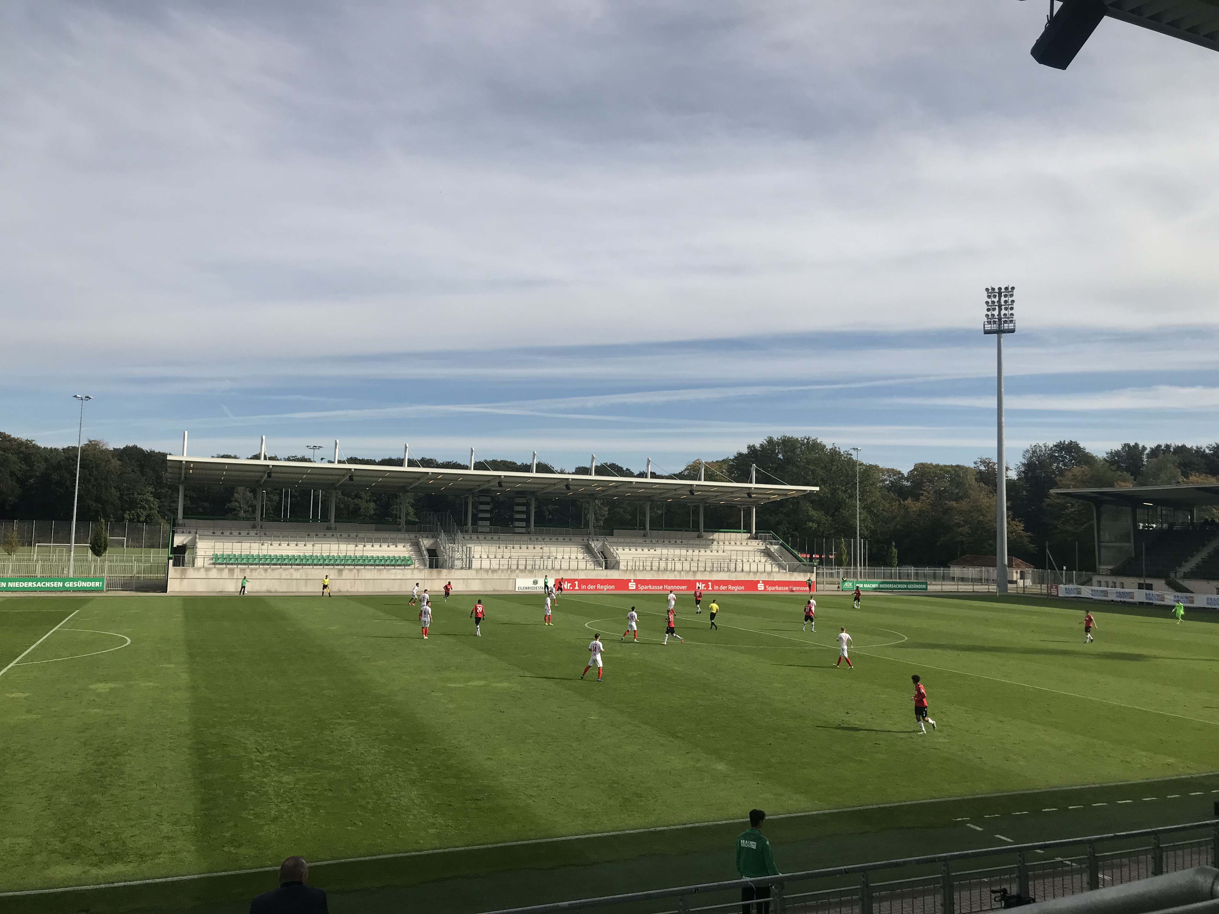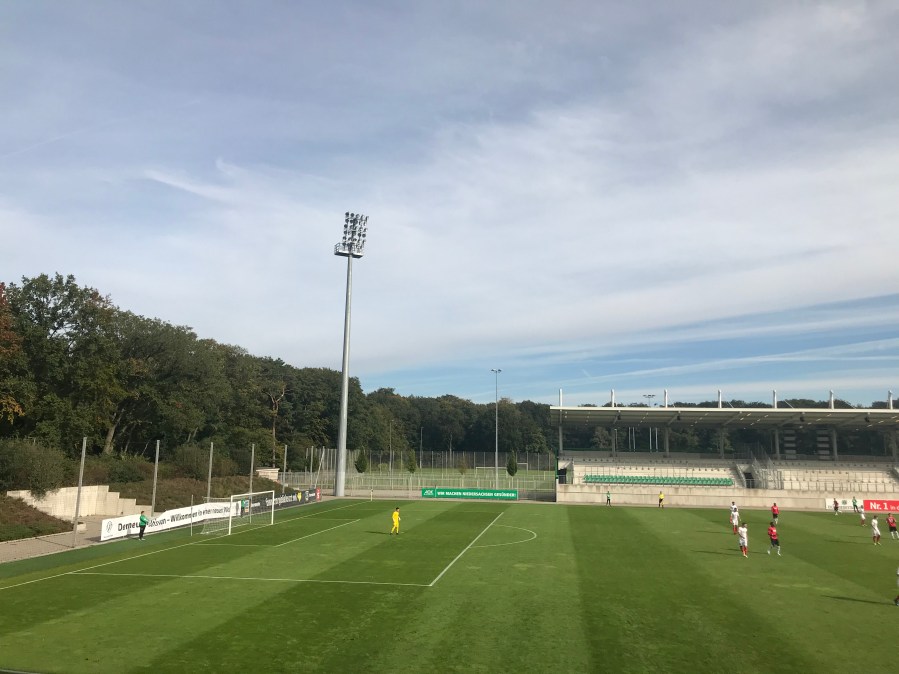 Es war ein schöner und sonniger Herbstsonntag und der Hannover-Doppler drängte sich quasi auf. Er drängte sich sogar so sehr auf, dass selbst die Grummelqueen und Bero nach erstaunlich wenig Protest den Plan mittrugen. Um 13:00 spielte die zweite Mannschaft von Hannover 96 gegen Borussia Hildesheim im Eilenriedestadion. Bei der Recherche im Vorfeld kam zunächst ein wenig Wehmut auf, dass das Stadion im Jahr 2016 komplett renoviert wurde. Beim Umbau wurde das Spielfeld um 90 Grad gedreht, sodass die denkmalgeschützte Tribüne mit den Holzbänken heute als Hintertortribüne fungiert. Ansonsten wurde durch die Renovierung ein funktionales und grundsolides Amateurstadion geschaffen, das an zwei von drei Seiten ausgebaut ist. Das Stadion liegt idyllisch am Rande der Eilenriede- einem hannoverischen Stadtpark.