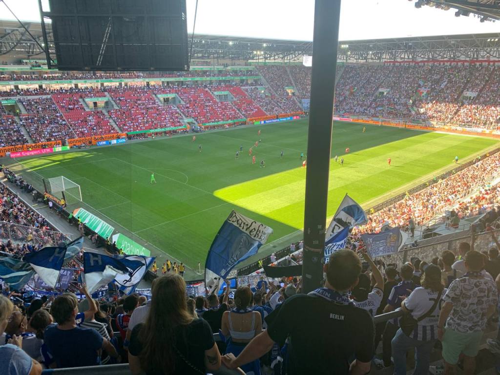 Die wenigen Minuten zum Stadion legte ich sodann zu Fuß zurück und konnte durch einen schnellen Schritt noch eine kleinere Gruppe Herthaner einholen, die vom Bahnhof kam. So gab es schon die ersten Hallos und gemeinsam fanden wir den Weg auf den Gästeparkplatz. Dort waren Teile der aktiven Fanszene schon eingetroffen und so gab es weitere freudige Wiedersehen. Das Gefühl wieder dazu sein, war verrückt. Für mich ein wahnsinnig besonderer Moment, während für die anderen ein Auswärtsspiel in Augsburg schon fast wieder Routine war. Für mich war es wie ein Nachhausekommen und es fühlte sich so an als wäre das Leben auf diesem hässlichen Gästeparkplatz mit diesen Leuten, so wie es eben sein sollte.