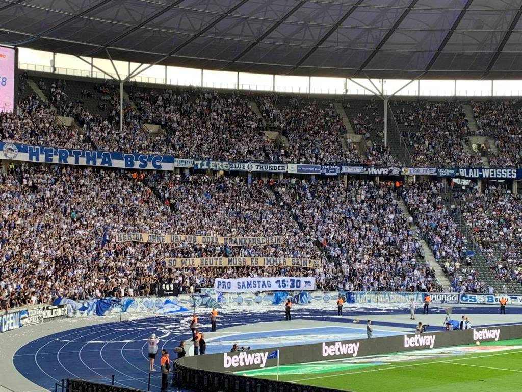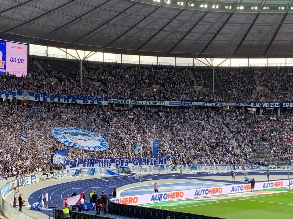 Die Ostkurve Hertha BSC zeigte ebenfalls eine gute Leistung. Man kann förmlich die neue positive Grundstimmung rund um Hertha BSC spüren. 90 Minuten wurde die Mannschaft unterstützt und auch optisch machte die Kurve wie gewohnt eine gute Figur. Nach dem Spiel wurde die Mannschaft mit viel Applaus empfangen. Zudem gab es noch eine kleine Ansprache, die die Kampfbereitschaft der vergangenen Spiele honorierte. Als Zeichen der Geschlossenheit hakten sich dann Mannschaft und Kurve ein und ballerten gemeinsam das letzte Lied des Tages heraus. Weitermachen, Hertha BSC!