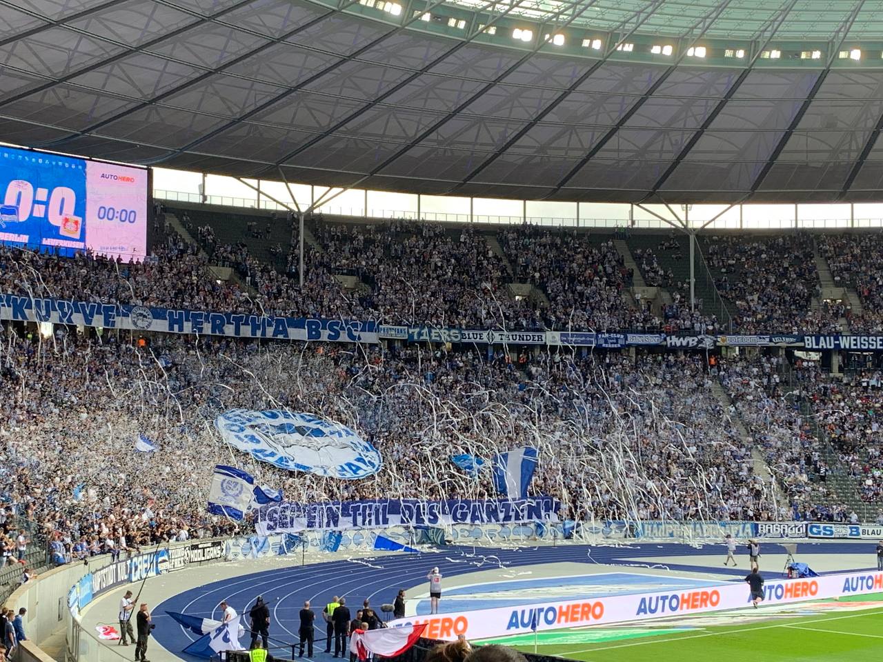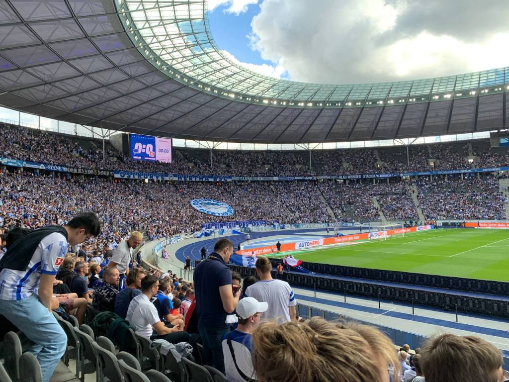 Es ist schon jedes Mal ein tolles Gefühl in die Ostkurve einzulaufen. Nach so langer Abwesenheit potenzierten sich die Glücksgefühle natürlich noch einmal. Das klingt vielleicht auch ein wenig pathetisch: Aber es ist auch wirklich ein atemberaubendes Gefühl nach unten in die Kurve zu laufen und es erfüllt mich jedes Mal mit Ehrfurcht so weit unten im Herzen unserer Kurve stehen zu können. Das gilt umso mehr, da ich natürlich in der vergangenen Zeit auslandsbedingt nicht unbedingt mit Präsenz glänzen konnte. Ostkurve Hertha BSC!