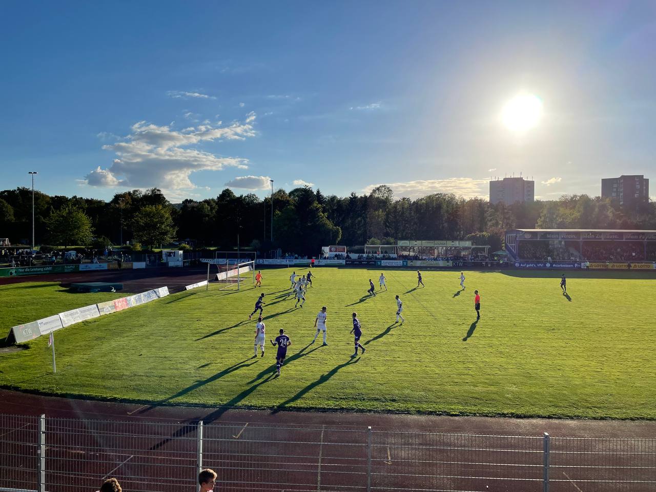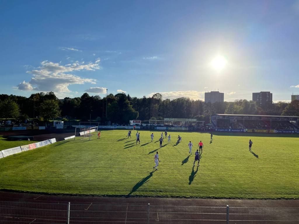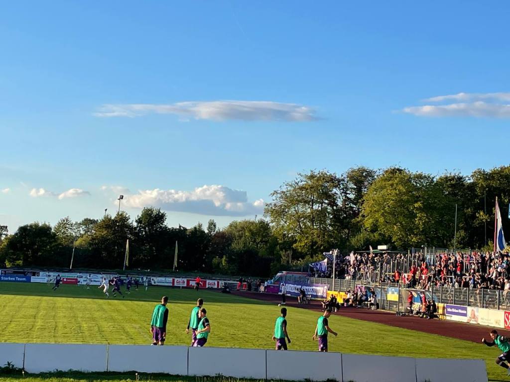 Die Sonne kämpfte sich pünktlich zum Anpfiff durch die dichte Wolkendecke und so wurde es ein wunderbarer Spätsommerabend. Wir schälten uns alle aus unseren Pullis und Jacken und genossen das wunderbare Wetter. Auf dem Platz entwickelte sich eine erstaunlich ausgeglichene Partie. Der Klassenunterschied war zu keinem Zeitpunkt zu erkennen und Hildesheim hatte sogar mehr Spielanteile und die besseren Chancen. Osnabrück betrieb Minimalaufwand- war jedoch ausgesprochen abgezockt. Nach einer Ecke von Hildesheim, spielten sie einen abseitsverdächtigen Konter zu Ende und gingen mit 0:1 in Führung. In der Folge drückte Hildesheim auf den Ausgleich, konnte den Ball aber nicht im Tor unterbringen. In der Schlussphase machte Osnabrück dann alles klar und Hildesheim zeigte Auflösungserscheinungen. So hieß es am Ende 0:3, was definitiv etwas zu hoch ausfiel.