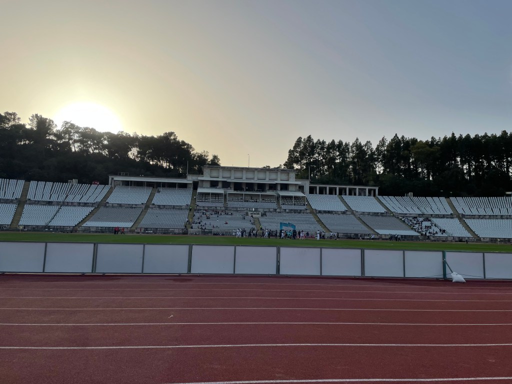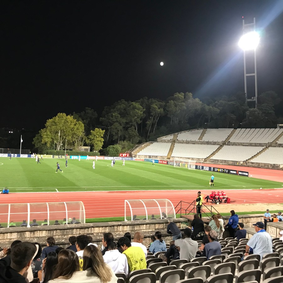 Das Estádio Nacional do Jamor ist einfach eine absolute Augenweide und erinnert mich mit der monumentalen Architektur sogar ein bisschen an das Berliner Olympiastadion (Keine Angst, ich weiß um die Entstehungsgeschichte des Olympiastadions). Wir mussten eine halbe Runde drehen, um auf die Tribüne auf der gegenüberliegenden Seite zu gelangen und fanden ein nettes Plätzchen auf Höhe der Mittellinie. Das Stadion ist komplett unüberdacht und insbesondere die steilen Kurven sind ein absoluter Hingucker. Geöffnet waren heute nur zwei Blöcke im Heimbereich und der Gästeblock, denn das Zuschauerinteresse war sehr überschaubar. Mit vereinten Kräften hoben wir durch unsere Anwesenheit die Zuschauerzahl noch auf über 400. Beim niederklassigeren Stammverein Belenenses waren im letzten Sommer sogar mehr Leute. Circa 120 Gäste hatten sich im Gästeblock eingefunden und unterstützten ihre Mannschaft immer mal wieder durch Gesänge. Im Heimbereich gab es bis auf ab und zu einen Schlachtruf keinerlei Unterstützung.