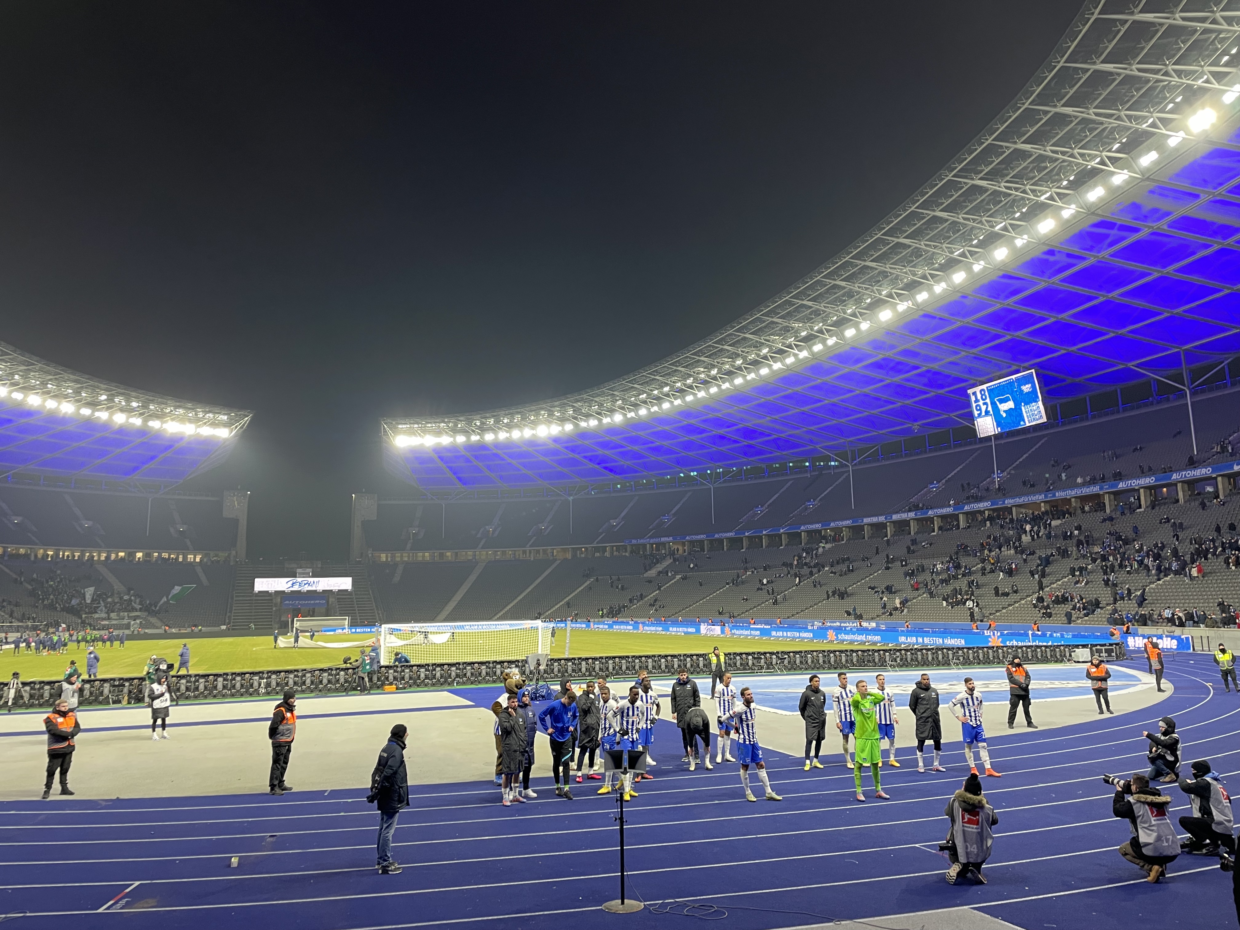 So kam ich leicht verspätet am ausgemachten Lokal an und traf Nemo. Bei guten Speisen redeten wir über verschiedene Themen rund um Hertha BSC und nach einem kurzen Boxenstop ging es dann zum Olympiastadion. Die U-Bahn fuhr nur bis nach Neu-Westend, sodass wir den letzten Kilometer zu Fuß zurücklegten. So könnte es für mich gerne öfter sein. Mit der Stadionöffnung gingen wir dann rein und verbrachten die nächste Stunde, um Aufkleber, Kalender und die Choreoschals aus Bochum an die Herthaner und Herthanerinnen zu bringen. Das machte wie immer sehr viel Spaß und trotz der geringen Zuschauerzahl heute, war eigentlich konstant etwas los.