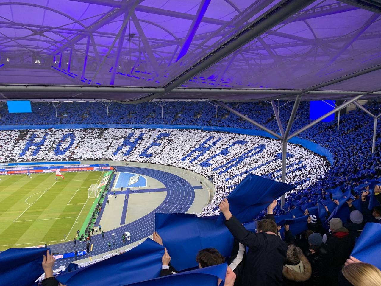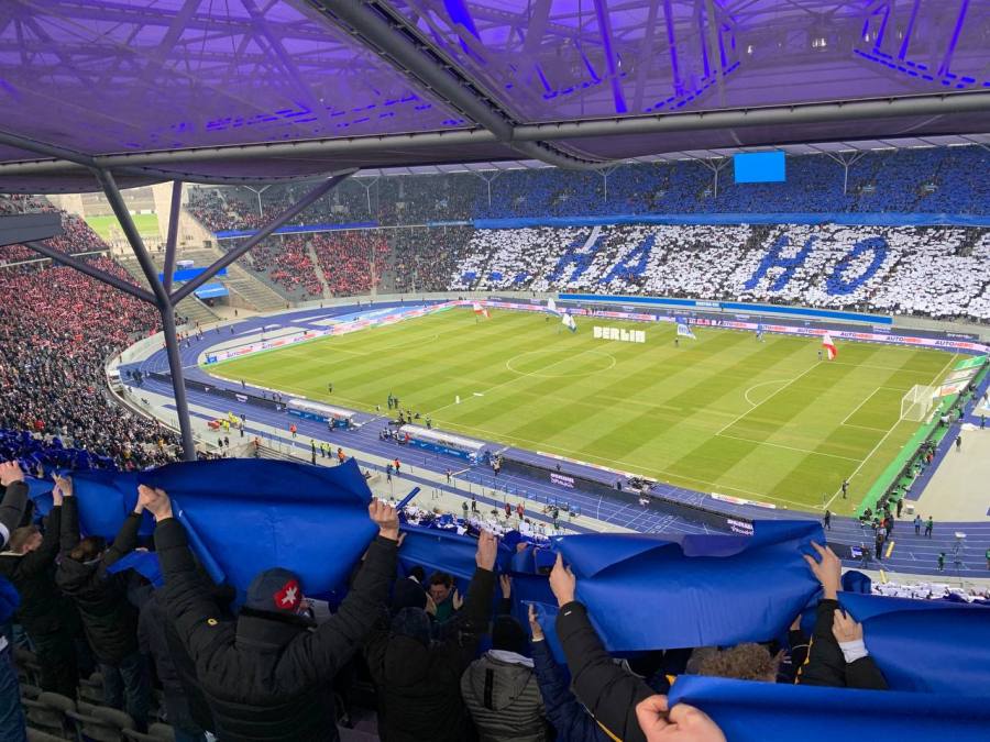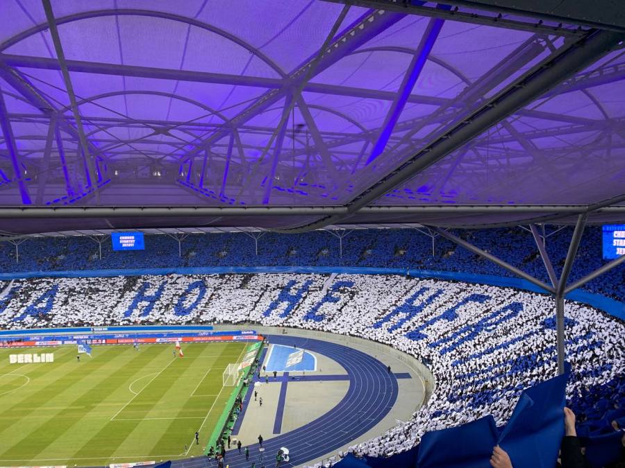 Ich ging dann kurz nach der Stadionöffnung rein. Neben einigen etwas frustrierten Gesprächen, verbrachte ich eine halbe Stunde in der Schlange für einen Hakiki Döner. Irgendwie war zu diesem Zeitpunkt auch alles schon egal. Helfer für die Choreo gab es noch mehr als genug, sodass wir gegen 14:30 runter in die Kurve gingen, um sicherzustellen, dass es nicht ausgerechnet im unteren Bereich der Kurve zu Lücken kommen würde. Immer wieder schweifte mein Blick nervös durch das weite Rund, um zu erahnen wie viele Leute schon im Stadion waren und ob das erhoffte Bild zu Stande kommen würde. Ich glaube mit Blick auf die Umstände kann man mit dem Bild sehr zufrieden sein. Nicht jeder Buchstabe kam komplett perfekt zur Geltung, aber im Großen und Ganzen hat das gut und diszipliniert geklappt. An solche Ausmaße kann ich mich im Olympiastadion auch noch nicht erinnern und mit Blick auf anwesende Unioner hatten wir richtig kalkuliert, indem wir auf der Haupttribüne bis zur Mittellinie gingen und auf der Gegentribüne fast bis zur Plexiglasscheibe. Am Ende wurde ein gewaltiges „Ha Ho He Hertha BSC“ sichtbar.