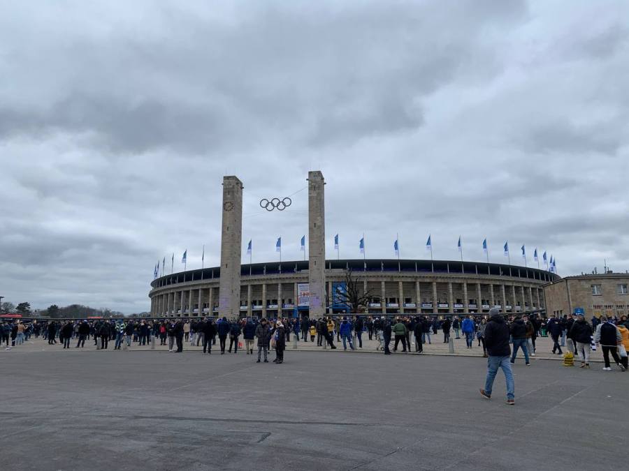 Am Derbyvormittag hatte ich dann wieder etwas unverhofft Leerlauf und konnte daher entspannt in den Tag starten. Nach einem Frühstück ging es dann aber doch recht zeitig nach Charlottenburg. Von dort lief ich dann mit einigen Stops zum Olympiastadion. Mit meiner Ankunft erhielt ich dann die Nachricht, dass ein Haufen von circa 300 Herthanern in einer S-Bahn festgehalten wird und eine erkennungsdienstliche Behandlung angeordnet wurde. Schon auch irgendwie wild, denn zu diesem Zeitpunkt war ja noch nicht wirklich etwas passiert. Dementsprechend ernüchtert waren die übriggebliebenen Herthaner am Parkplatztreff. Schnell war zumindest klar, dass wir versuchen die Choreo durchzuziehen. Außerdem kam noch einmal Hoffnung auf, denn das Gerücht machte die Runde, dass der Haufen zur späten ersten Halbzeit am Olympiastadion eintreffen würde.