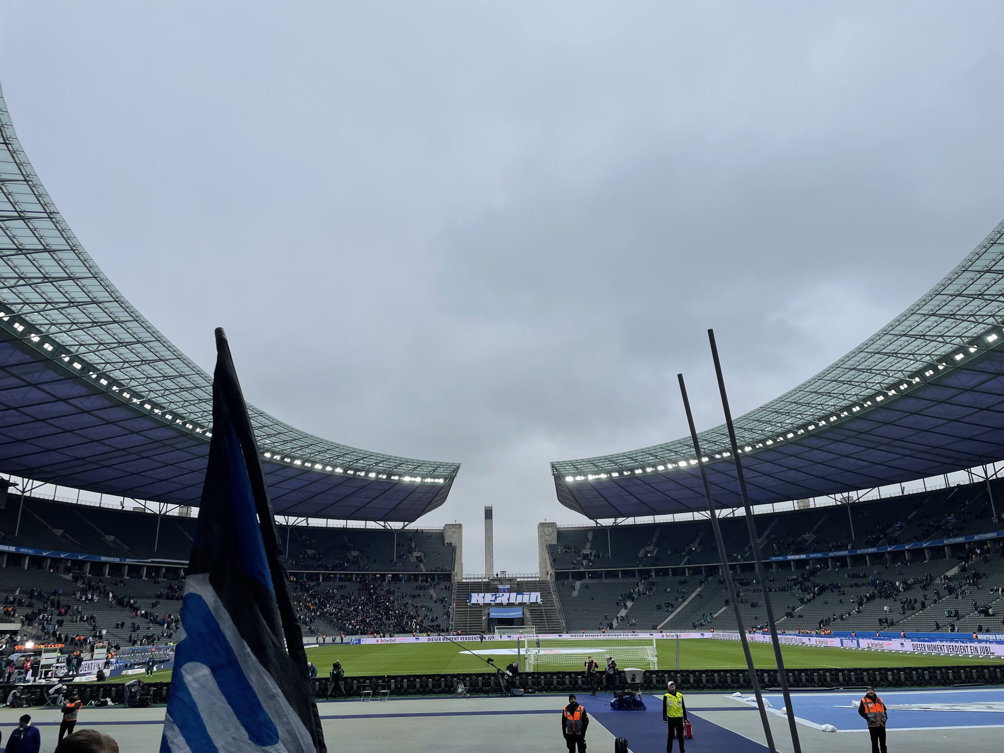 Ich ging dann heute auch früh in die Kurve und sog die Atmosphäre auf. Unser Olympiastadion ist einfach besonders und das wird einem umso bewusster, wenn man nicht jedes zweite Wochenende die Chance hat die Ostkurve zu betreten. Heute war ein großer Zuschauerzuspruch zu erwarten. Die Fanszene des VFB Stuttgarts hatte aufgrund der sportlichen Relevanz des Spiels im Vorfeld mobilisiert. Gleichzeitig hatten offensichtlich auch viele Herthaner das Bedürfnis dem Abstieg noch einmal etwas entgegenzusetzen.