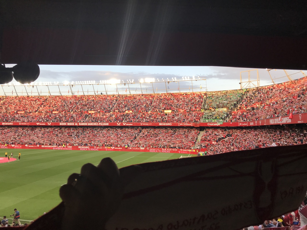 Ich empfinde solche Situationen dann immer als ziemlich unangenehm. Als Groundhopper ist man ja auch immer ein kleiner Voyeur und gerade in Spanien ist man mit einem mitteleuropäischen Aussehen relativ schnell als Fremdkörper zu enttarnen. Ich saß strategisch nah am Gang, sodass ich auch zahlreiche Leute vorbeilassen musste und fleißig gemustert wurde. Das Unwohlsein explodierte dann im Moment der Vereinshyme, als alle Leute voller Leidenschaft mitsangen und ich peinlich berührt die Lippen bewegte. Nun gut! Die Lektion gelernt und in Zukunft auf solche Rosinen vielleicht eher verzichten. Denn so fühlte es sich schon an, als ob man einem richtigen Sevilla Fan den Platz wegnehmen würde.