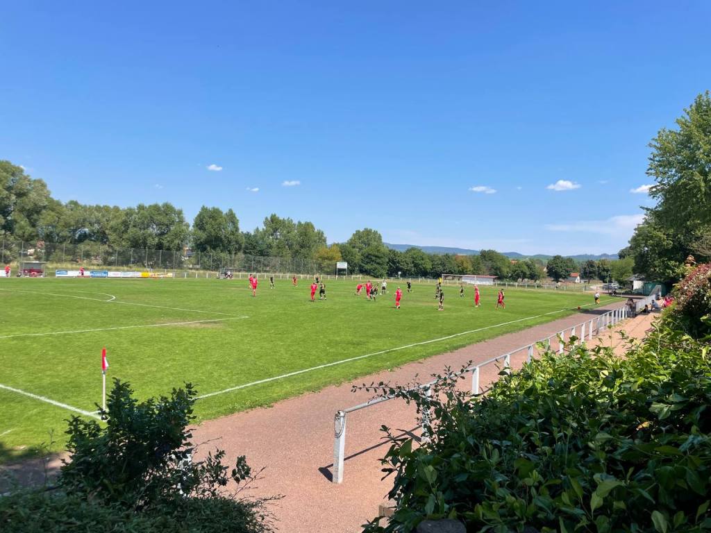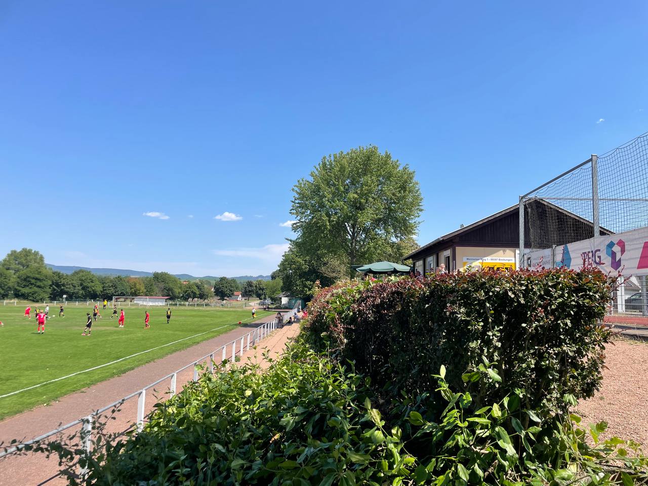 Das Navi zeigte dann eine Ankunftszeit kurz nach dem Anpfiff um 14:30 an. Kurz nach halb bogen wir auf den Parkplatz ein und hörten noch gerade so den Anpfiff. Puh! Wir suchten uns ein Schattenplätzchen und deckten uns dann recht schnell mit Getränken ein. Eine gute Auswahl und ein freundlicher Wirt sorgten für Freude! Wir verquatschten die Zeit und waren dann nur circa 20 Minuten später etwas verwirrt. Ein Pfiff- na gut, Trinkpause! Nur leider liefen die Mannschaften in die Kabinen… Was war denn hier los? Ich fragte den letzten Spieler ob hier heute aufgrund der Hitze nur 2*20 Minuten gespielt würden. Das verwirrte „Nein“ verwirrte mich ebenfalls!
