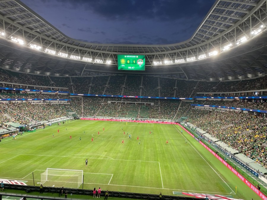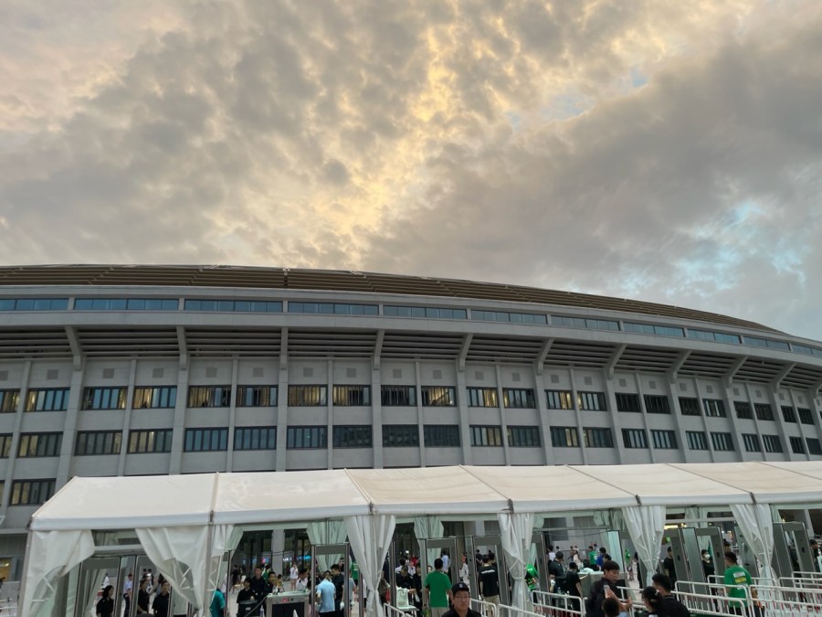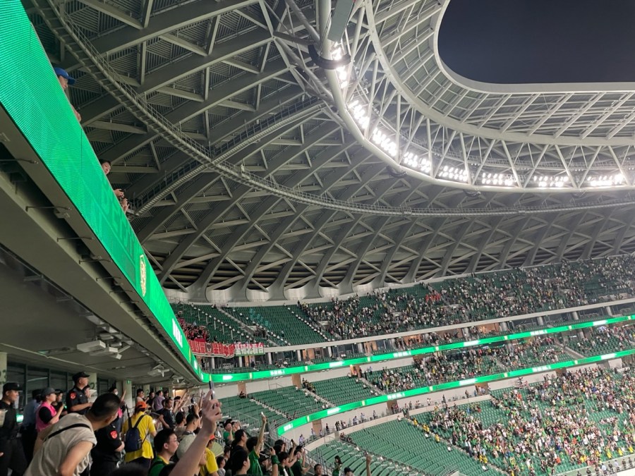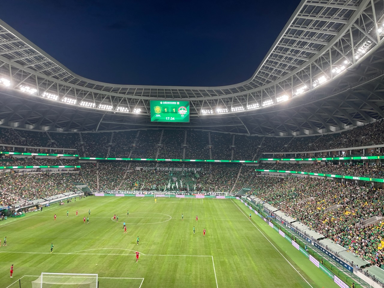 Im dritten Anlauf waren wir dann endlich erfolgreich und konnten die Sicherheitskontrolle passieren. Zu diesem Zeitpunkt wurde bereits die Nationalhymne gespielt. Zum Glück wurde jedoch erst um 19:35 angestoßen- in meinem Kopf ging es bereits um 19:30 los. Dadurch saßen wir tatsächlich kurz vor dem Anpfiff auf unseren Plätzen. Wir waren heute im zweiten Rang und saßen genau auf der gegenüberliegenden Seite der Guoan-Kurve. Lediglich der Blick auf den Gästeblock war etwas verbaut. Das fiel heute aber nicht weiter in Gewicht, denn nur circa 50 Fans aus dem „nahegelegenen“ Henan liefen circa zur 20. Minute pöbelnd ein. Ansonsten wurden sie zwar regelmäßig beleidigt, traten aber selbst kaum in Erscheinung.