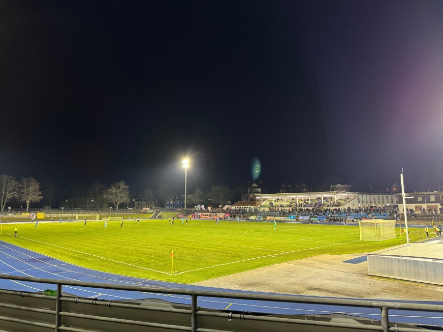 Nach so einem ereignisreichen Intro, mussten wir uns erst einmal wieder sammeln und auf kreativen Wegen auf die gegenüberliegende Seite kommen. Der direkte Weg war nämlich gesperrt, sodass wir über den Hang „anreisen“ mussten. Dort trafen wir dann auf eine Gruppe Herthaner und es wurde ein richtig netter Mittwochabend. So könnte es für mich gerne öfter sein. Herthaner aller Couleur stehen zusammen, quatschen und gucken sich nebenbei noch ein Spiel und eine Szene an. Das machte richtig Laune.