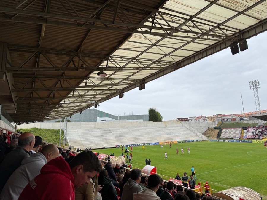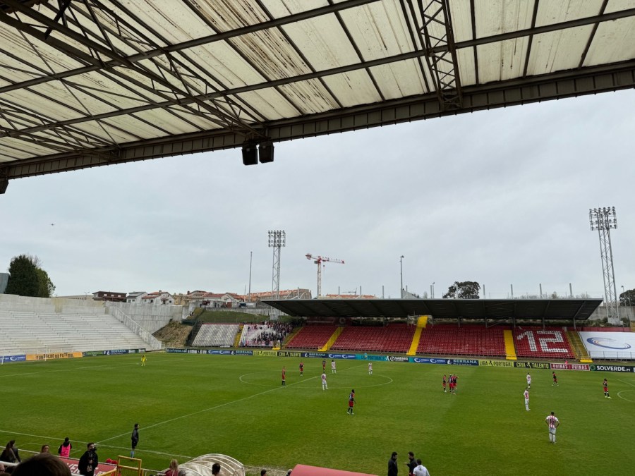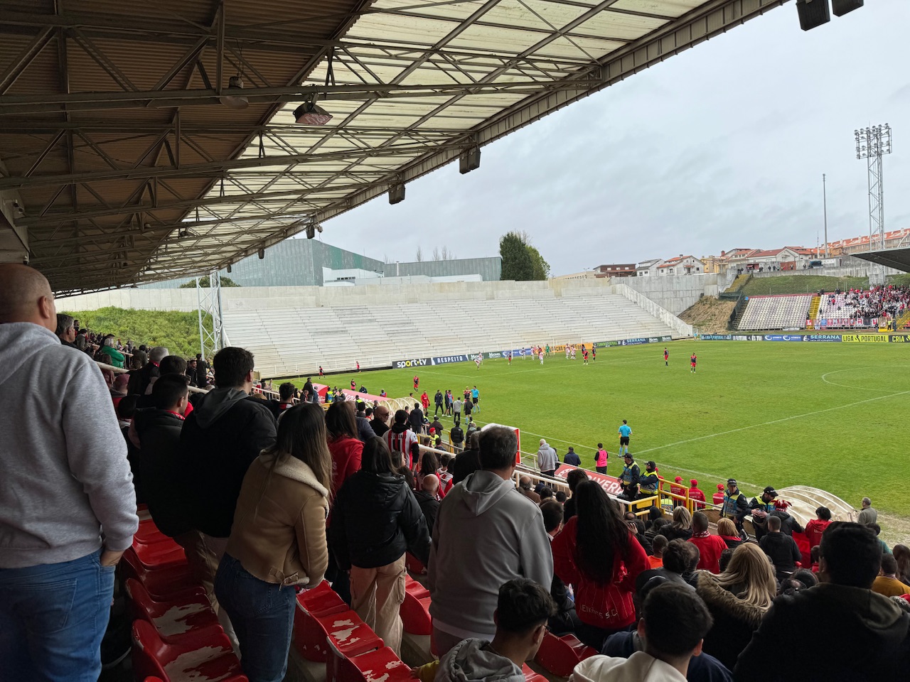 An der Schlange zum Einlass wurde ich dann aber natürlich gefragt, ob ich noch ein Ticket geschenkt haben wolle… schnell noch einen Café am Vereinskiosk. Ach, wie liebe ich doch Portugal und dann ging es mit einer Pepsi bewaffnet hoch auf die Tribüne. Es gab noch 1-2 Sitze ohne Vogelschiss, sodass sich die Sitzplatzwahl quasi von selbst erledigte. Beim Aussuchen der Partie hatte ich gar nicht groß auf den Gegner geachtet. Umso mehr freute ich, als ich im Bolt den Bus von Leiria überholte. Leiria hatte ich auch im Somme 2021 gesehen und war damals vom Spielbesuch wirklich begeistert.