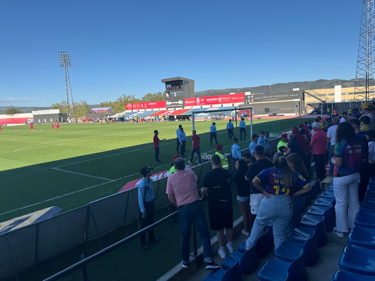 Ich fand einen schönen Platz auf der Hintertortribüne und war vom Andrang positiv überrascht. Aufgrund des fehlenden Alternativprogramms in Chaves schien sich hier ein Querschnitt der Gesellschaft zu versammeln: Von der Dorfjugend bis hin zum Renter-Ehepaar. Ebenfalls bemerkenswert: Hier wurde heute Vollbier ausgeschenkt und somit glich der Weg von der Tribüne bis zum Vereinsheim einer Autobahn und es wurde ordentlich gebechert. Das Stadion bot Ausbau an vier Seiten und einen herrlichen Ausblick auf die umliegenden Hügel. Das war erstligareif.