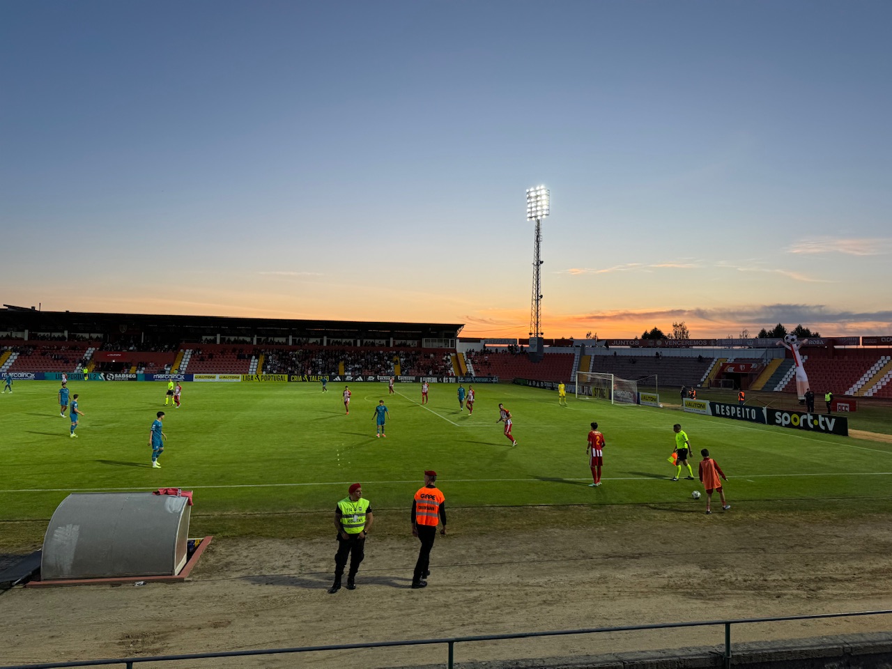 Das Stadion war mit knapp 1.300 Leuten eher spärlich gefüllt. Es gab einen kleinen Gästeblock, der vor allem aus Freunden und Familien der Spieler gefüllt war. Ansonsten gab es nur von ein paar Kids einige Gesänge für Aves. Auffällig war der desolate Zustand des Stadions. Das sprang selbst für portugiesische Verhältnisse noch einmal ins Auge und der Gang zur Toilette hatte durch das fehlende Licht, herunterhängende Kabel und tropfende Decken einen ziemlichen Gruselfaktor.
